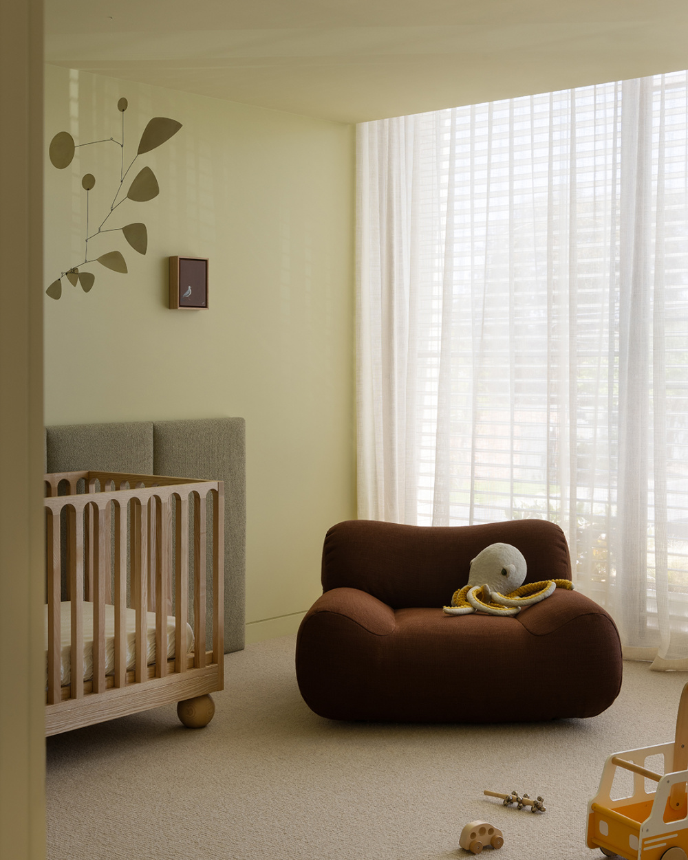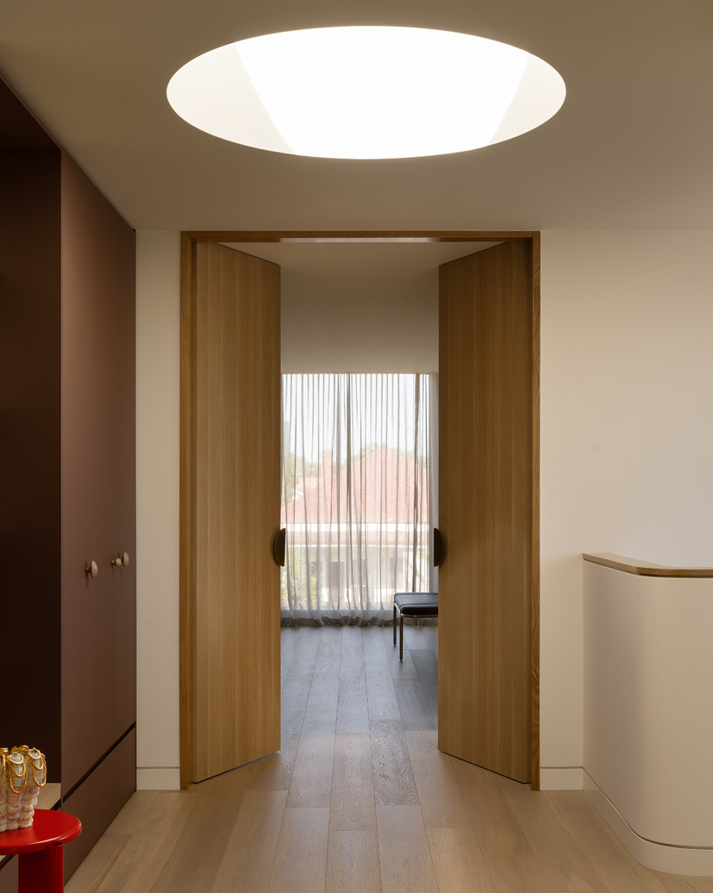 建筑的精湛工艺,在带大理石镶嵌的弧形木质楼梯上展现得淋漓尽致。木材的天然肌理与大理石的精致镶嵌形成 “粗犷与细腻” 的对话,弧形的曲线打破了几何的刻板,让上下楼的动线成为一场 “工艺欣赏的旅程”。楼梯通往宽敞的上层门厅,圆形天窗如天空的眼睛,将充足的自然光引入空间,让上层区域始终沐浴在柔和的天光中。空间的功能分区同样充满巧思:儿童房以独特色调点缀住宅前部,为孩子的成长打造充满个性的童话天地;父母套房则设于后部,私密的位置与宁静的氛围,契合长者对生活的需求。主卧的设计更是将 “豪华酒店质感” 融入居家生活,开放式卫浴的通透与观景阳台的开阔相得益彰,俯瞰后花园与泳池的景致,让休憩的时光充满了自然的诗意。