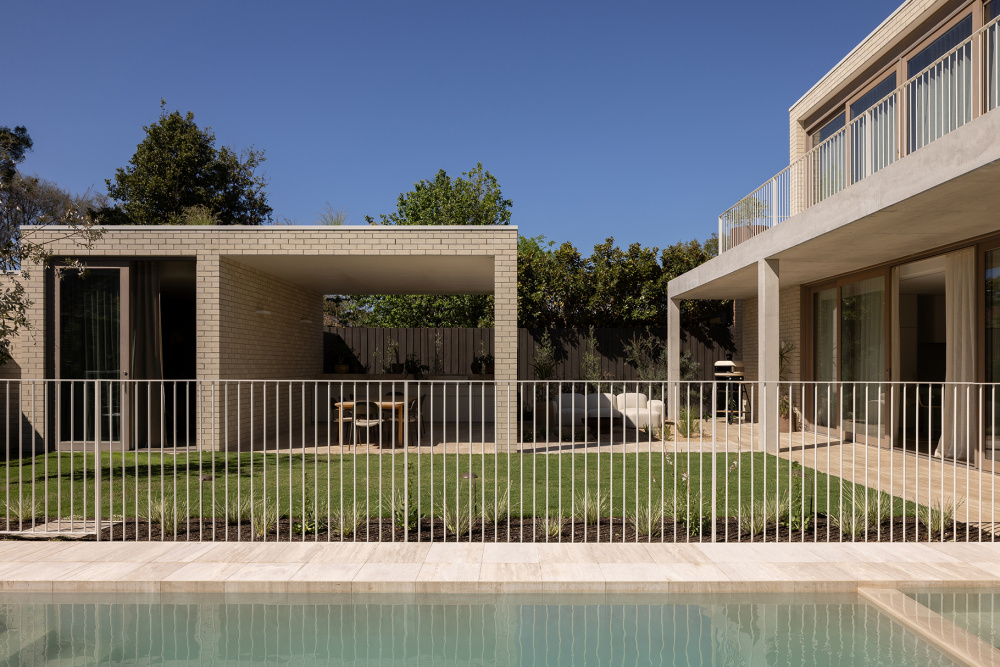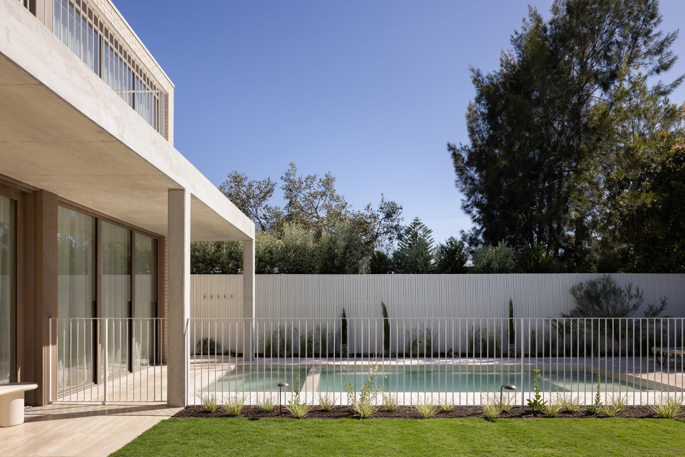 厨房用餐区与泳池房健身房之间的户外用餐区,是室内外空间自然衔接的关键节点。洞石铺地与入口门厅的材质形成呼应,让室内的 “自然奢华” 延伸至户外,模糊了 “内与外” 的边界。预制混凝土立柱与阳台既提供了实用的遮阳功能,又为建筑背面赋予了 “稳固、厚重且现代” 的视觉感受,让建筑的每一面都成为材质与功能的完美答卷。在这里,烹饪、用餐、运动、休憩的场景自然切换,材质的延续性让空间的转换毫无割裂感。洞石的冰凉在夏日带来舒爽,预制混凝土的坚固在风雨中守护生活,而木材的温暖则在户外家具中传递着家的温度 —— 室内外的衔接,最终成为 “材质、空间与生活场景” 的交响乐章。