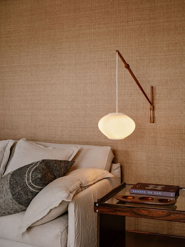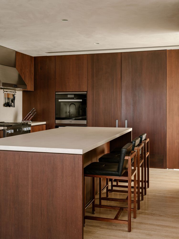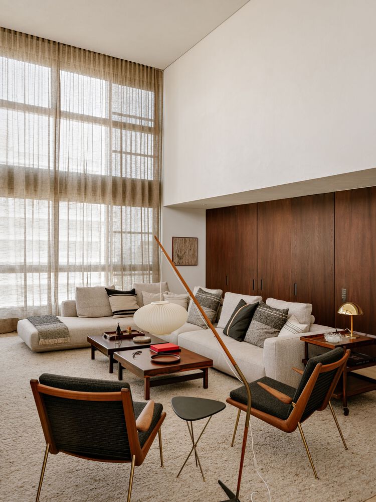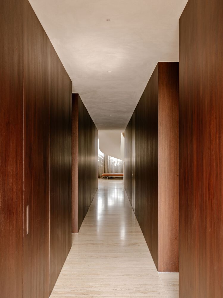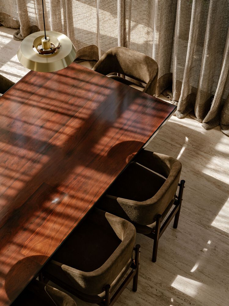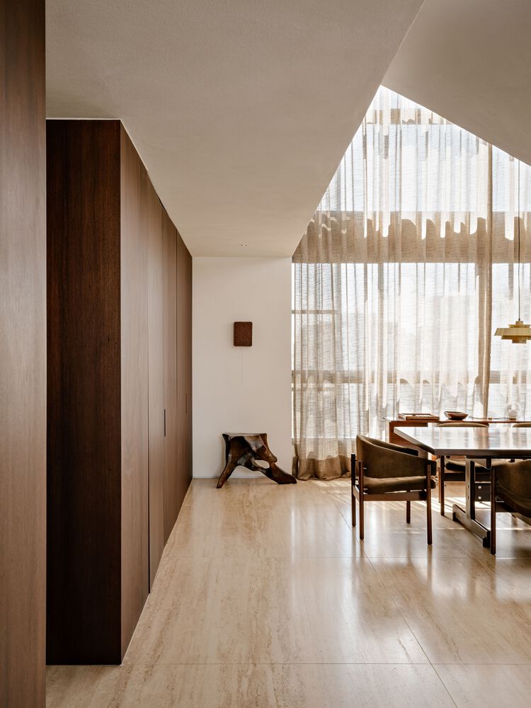 材质是该项目的核心要素。浅色洞石基底与深色木材饰面的体量相互搭配,营造出视觉与触觉上的对比。天然面料、草编材质和厚重窗帘的运用进一步强化了这一设计策略,无需多余装饰,便打造出精致的感官体验。家具的选择 —— 大部分是北欧风格,从国际市场精心挑选而来 —— 使整个项目呈现出一种精心打造的氛围,每一件家具都成为建筑的延伸。
