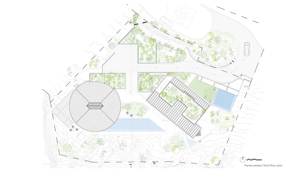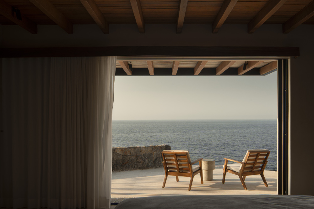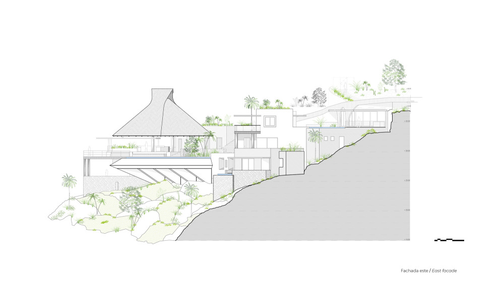 直径超 17 米、最低点高 11 米的巨型帕拉帕,是住宅的 “视觉与精神核心”。团队突破传统帕拉帕 “小型、临时” 局限,将其升级为 “兼顾抗候性与当代美学”的永久结构。以钢筋混凝土柱深植崖坡岩层提供稳固支撑,棕榈木横梁传递乡土温度,隐藏钢索与飓风锚固系统张拉平衡荷载,让帕拉帕能容纳主餐厅、吧台等公共功能,又保留手工质感;棕榈茅草屋顶形成 “自然穹顶”,阳光、海风自然渗透,既隔热又引导穿堂风;下方悬浮泳池采用混凝土悬挑,池面与海平面视觉延伸,游泳时似与大海无缝衔接,且架空空间保留自然地形,植被可继续生长。