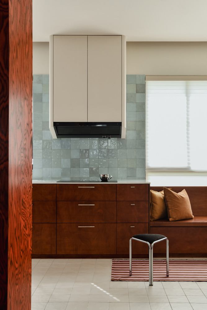 入口则被打造成精心编排的过渡场景。受弗兰克・劳埃德・赖特 “压缩与释放” 理念的启发,玄关以色彩而非形态营造空间戏剧感:浓烈的红色包裹出围合与私密感,继而将人 “释放” 至内部开阔宁静的天地。室内以柔和的米色为背景,化作中性的表达画布。这种视觉留白让家中的收藏品 —— 每件物品皆因形态、故事或精神被选中 —— 得以闪耀。它们不刻意争夺注意力,而是彼此和谐,如点缀家居的 “雀斑”,含蓄表达,从不喧宾夺主。