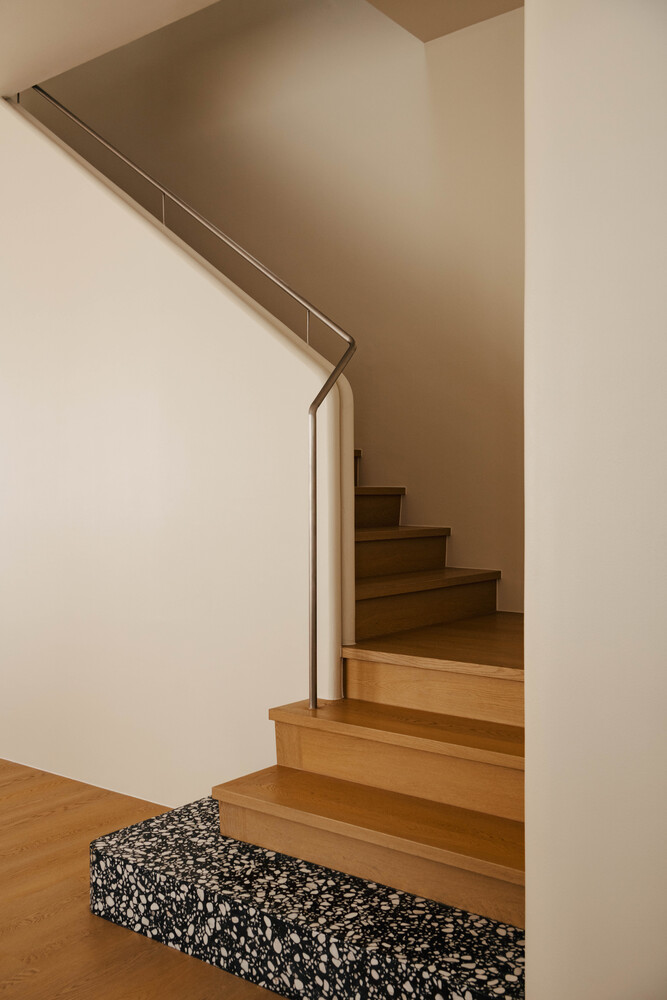 设计的核心是目的性极强的材料组合,将住宅锚定在中世纪根源中:带有深红底色的染色胶合板,以丰富的触感呼应经典木饰面;精致发丝纹理的不锈钢则以冷冽通透形成对比。这些材料在楼梯处碰撞出动态美感 —— 定制弯曲的不锈钢栏杆如雕塑般悬浮,在温暖与现代感间达成完美张力。
