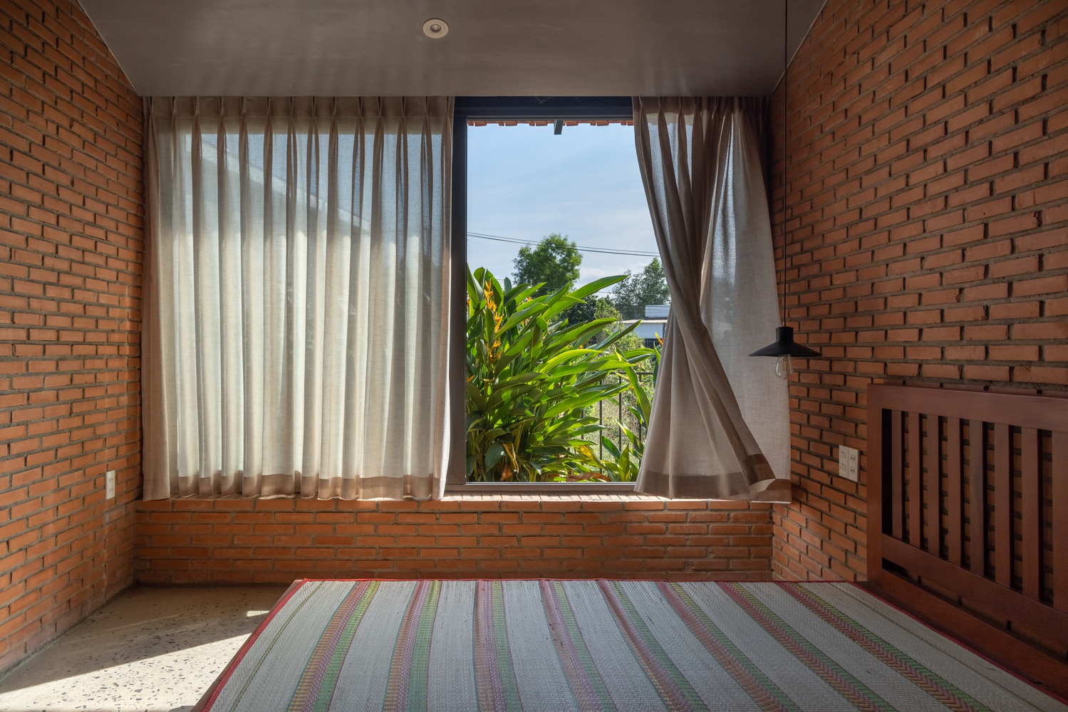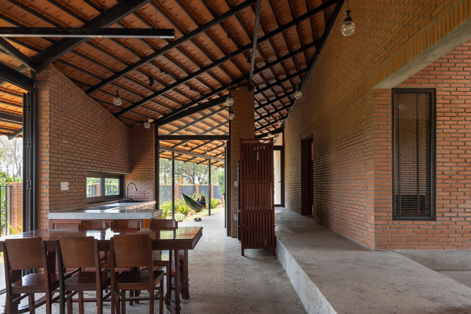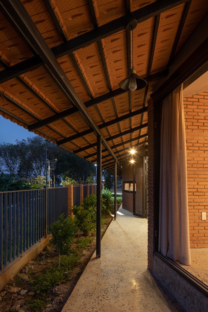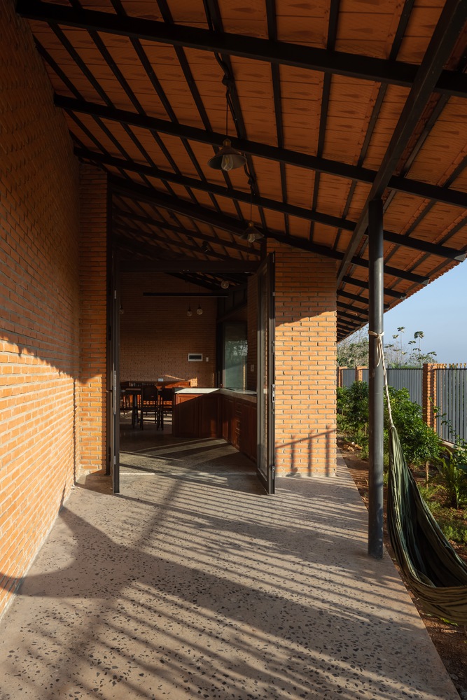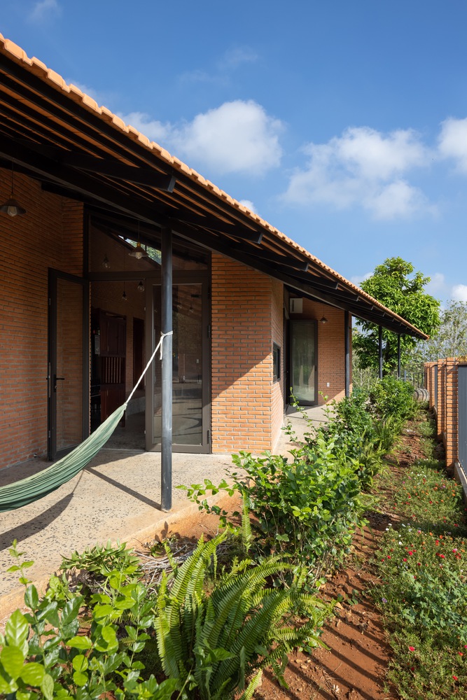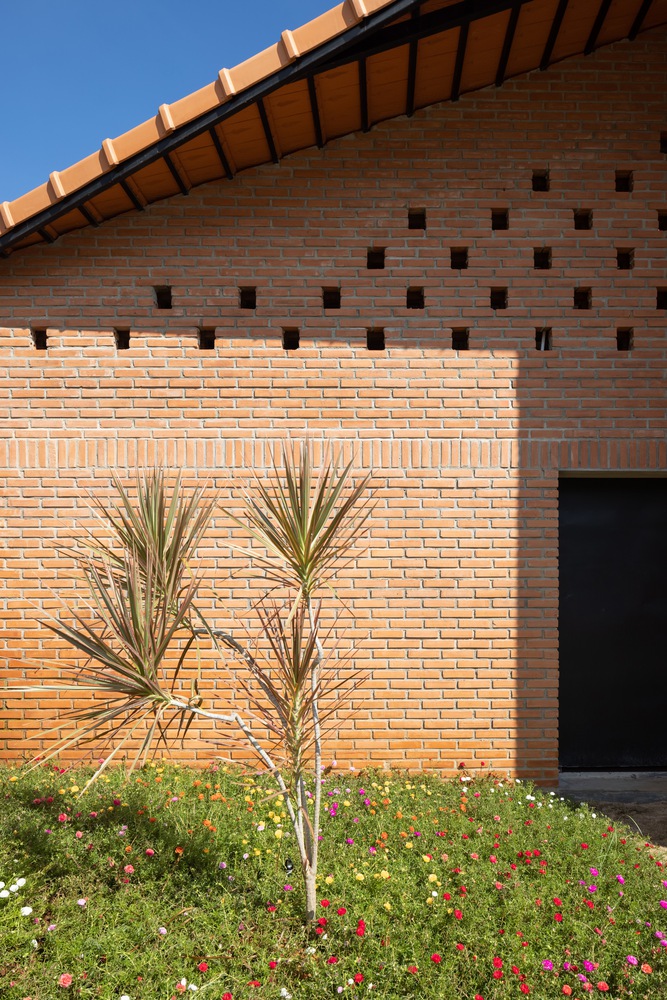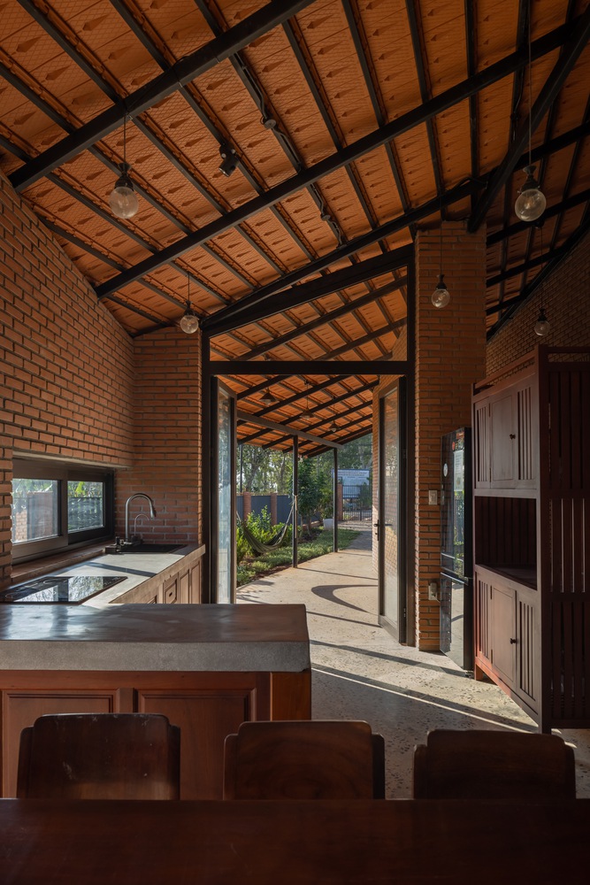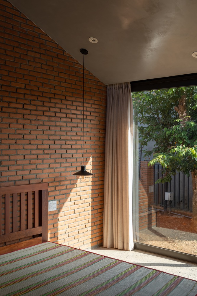 设计方法 —— 住宅仅使用两种主要材料,即同奈省当地的砖块和瓦片,营造出统一的色调与质感。这种材料的统一性为空间和形态的组织提供了自由。一道长长的砖墙沿着场地延伸,划分出生活区域和服务区域,而折叠的瓦屋顶打造出富有动感的天花板高度,并沿东西轴线过滤光线。