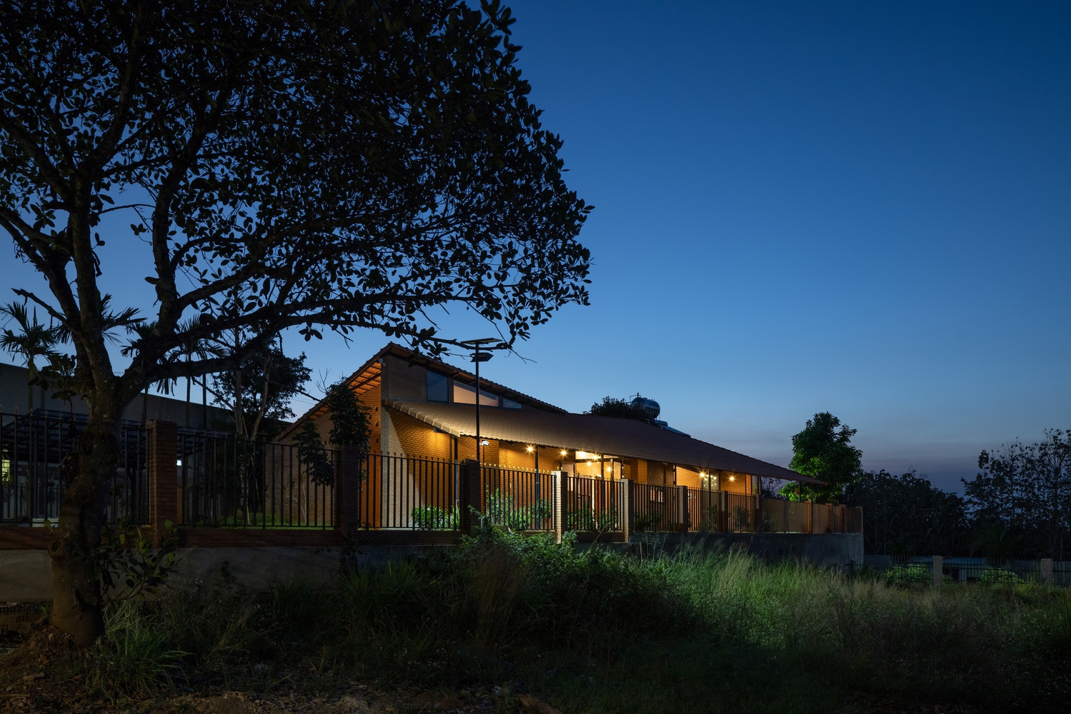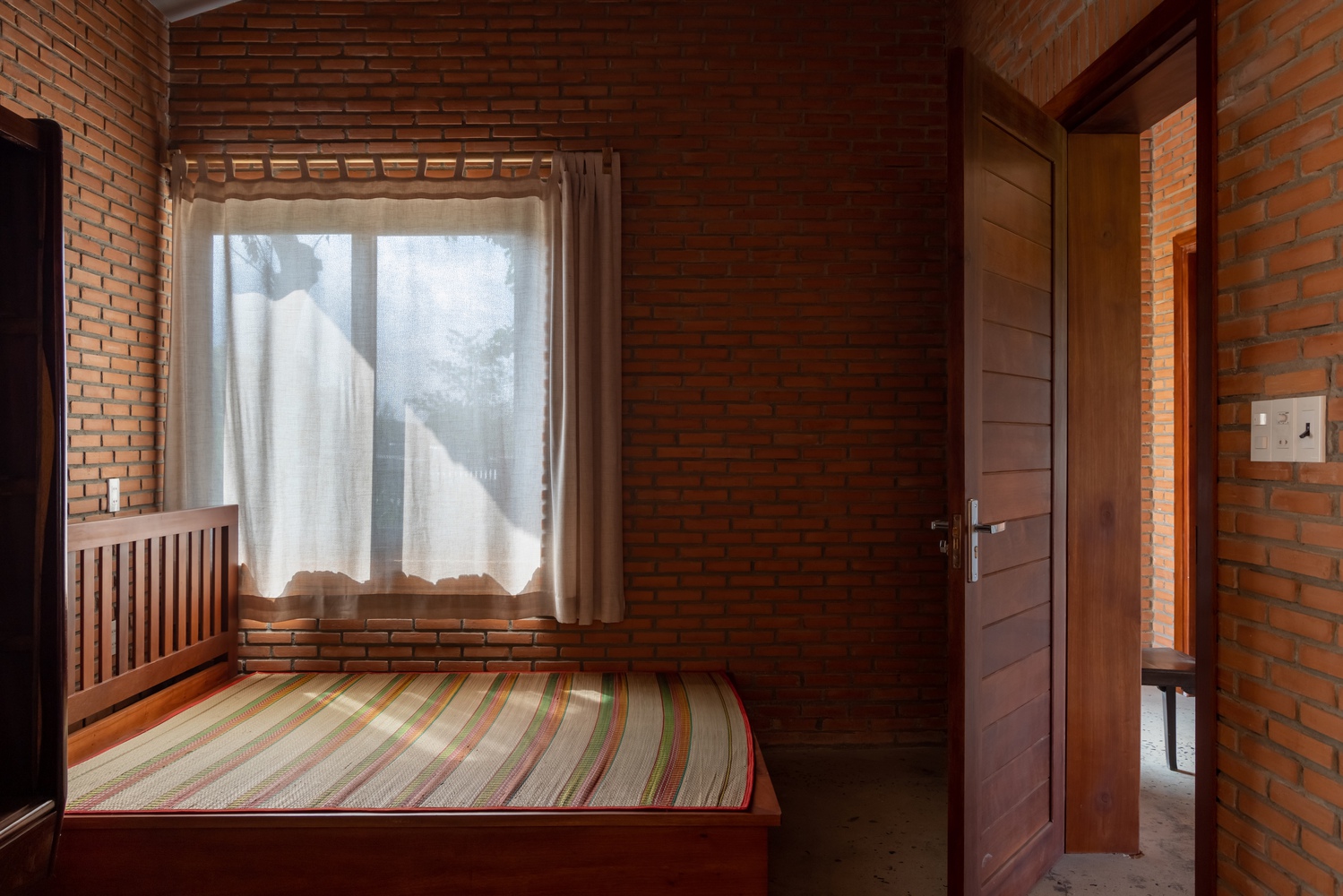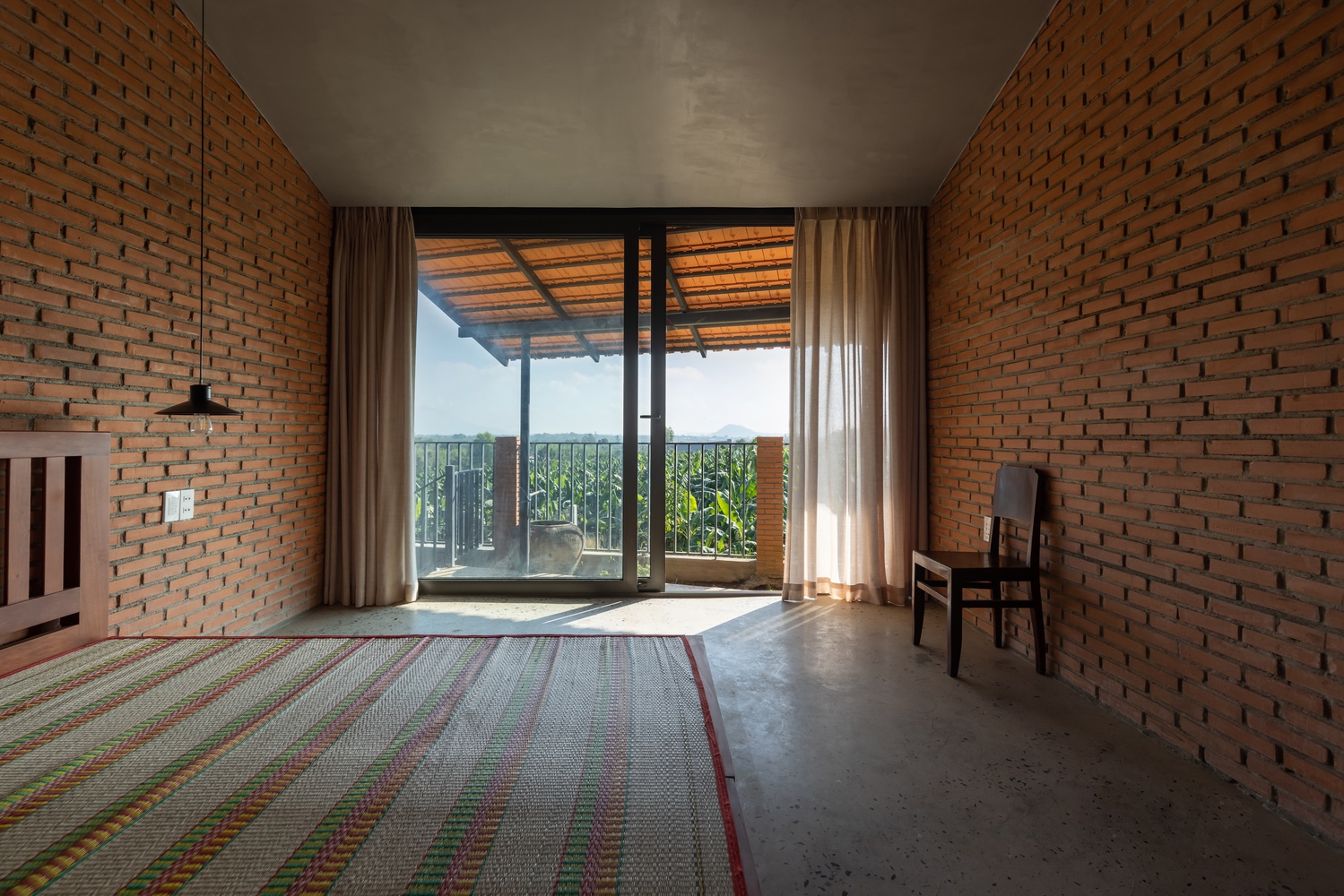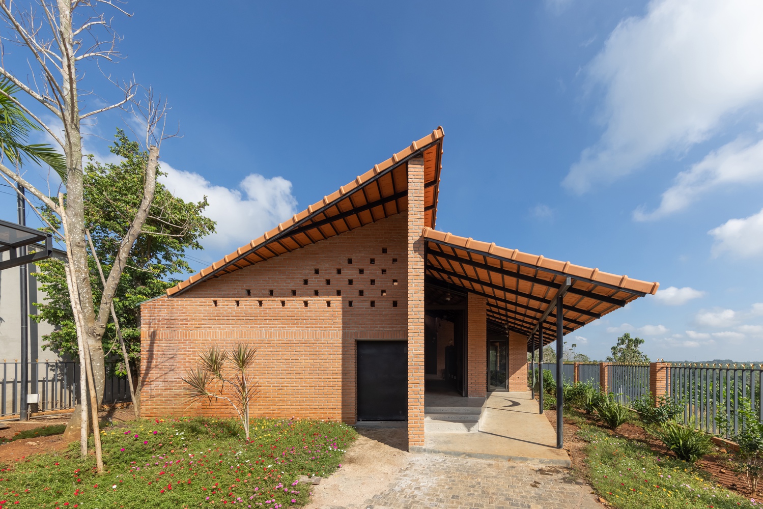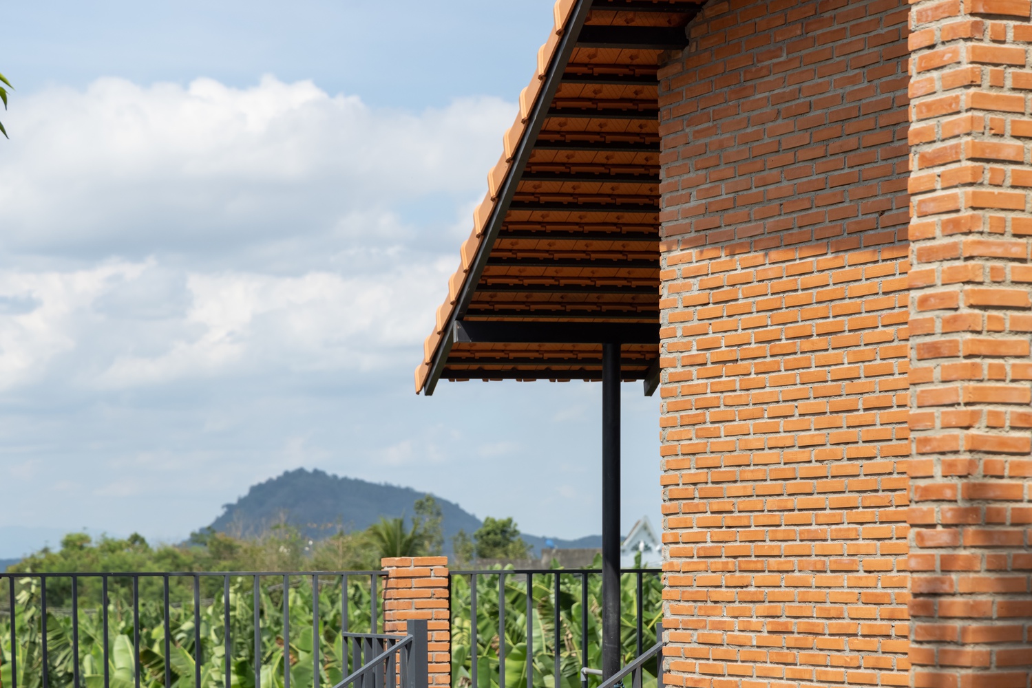 设计方法 —— 住宅仅使用两种主要材料,即同奈省当地的砖块和瓦片,营造出统一的色调与质感。这种材料的统一性为空间和形态的组织提供了自由。一道长长的砖墙沿着场地延伸,划分出生活区域和服务区域,而折叠的瓦屋顶打造出富有动感的天花板高度,并沿东西轴线过滤光线。