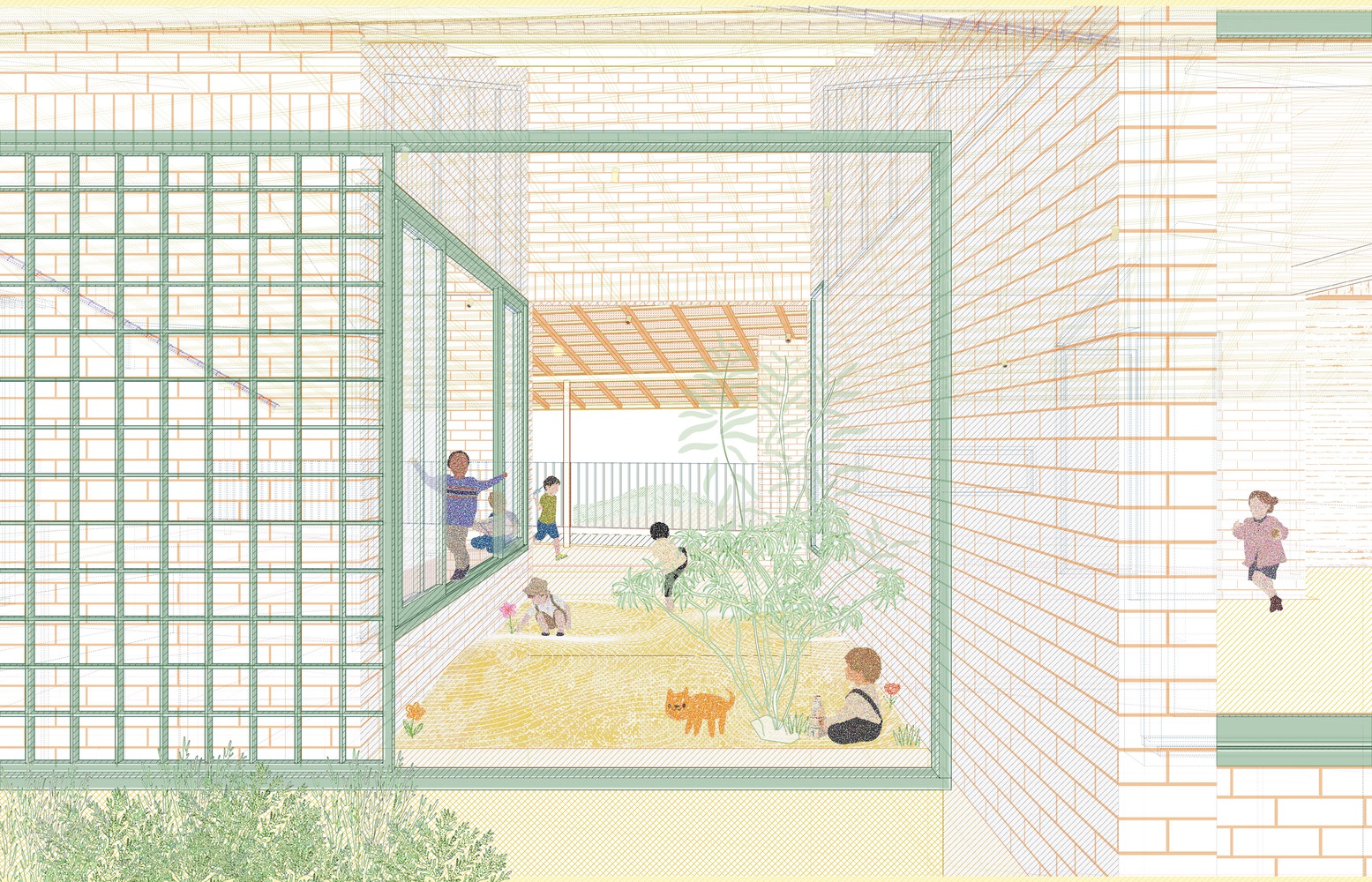 空间策略 —— 住宅采用线性布局,以最大限度地利用花园空间。延伸的屋檐界定了关键的户外区域:入口门廊、半户外起居区以及主卧室的私人阳台。一个小型中央庭院兼具安全的游戏区和自然通风核心的功能,能将微风从屋后引入屋前。