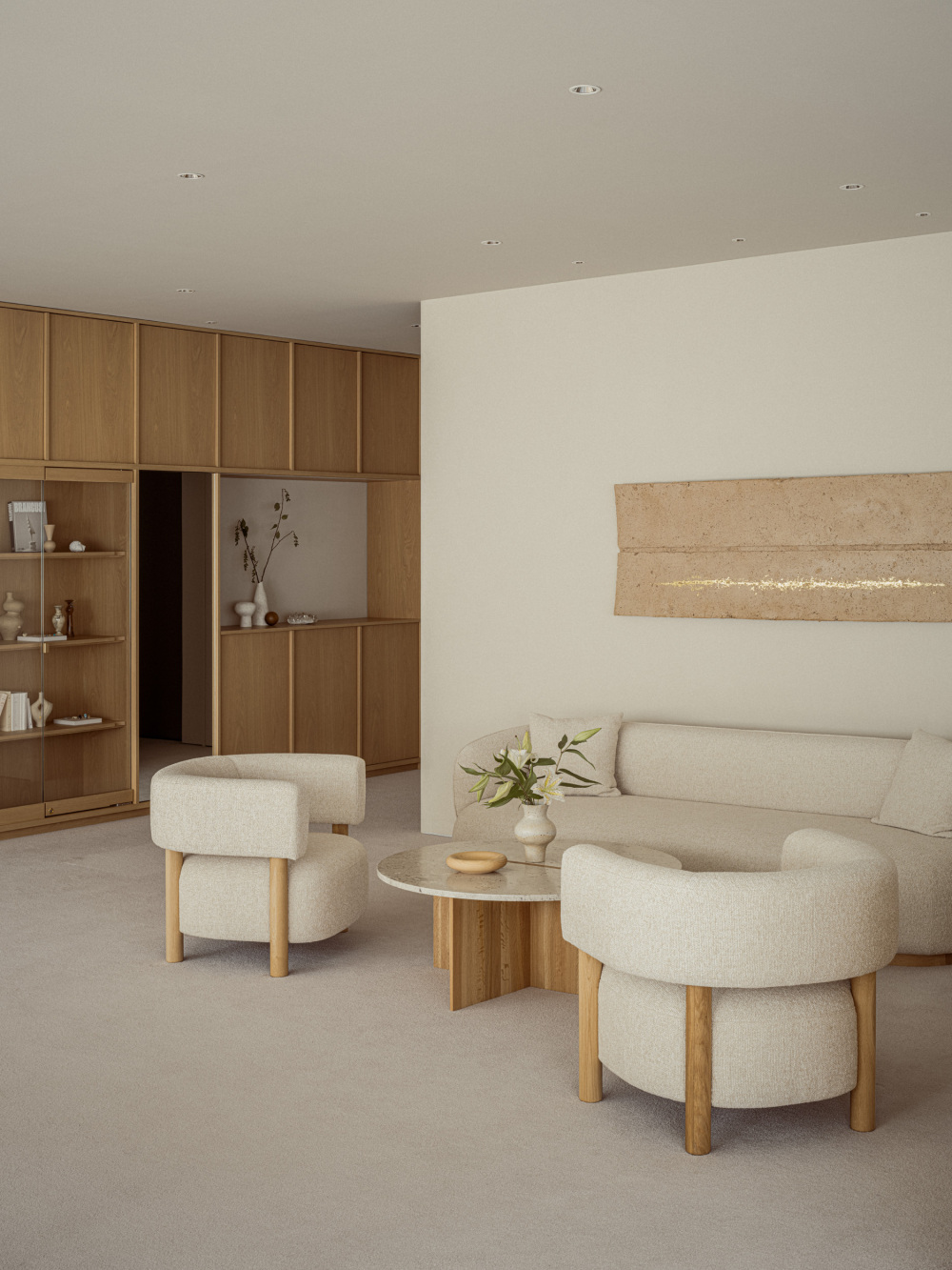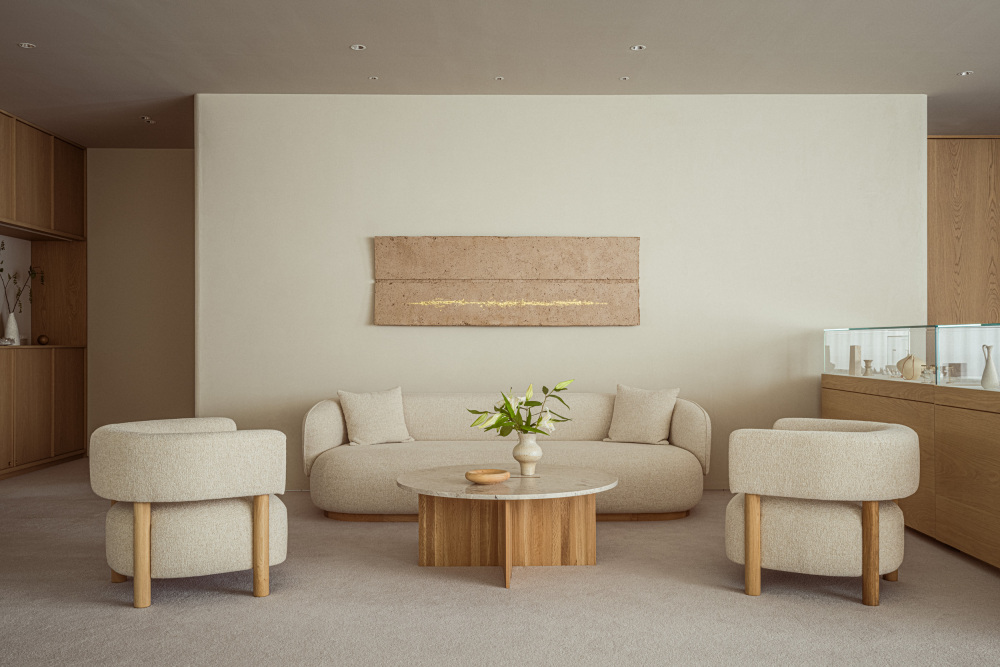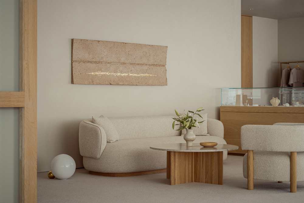 最终,MARIHA 沙龙呈现的并非一个单纯的「卖珠宝的地方」,而是一处「有珠宝的私人会客厅」。在这里,办公区与展厅无缝衔接,却丝毫不见杂乱:工作人员可在休闲区旁处理事务,宾客浏览珠宝时若有疑问,转身便能得到专业解答;午后阳光透过窗户洒在橡木家具上,有人在展架前驻足欣赏珠宝,有人在沙发上轻声交谈,偶尔传来的笑声,让整个空间充满了家的烟火气。