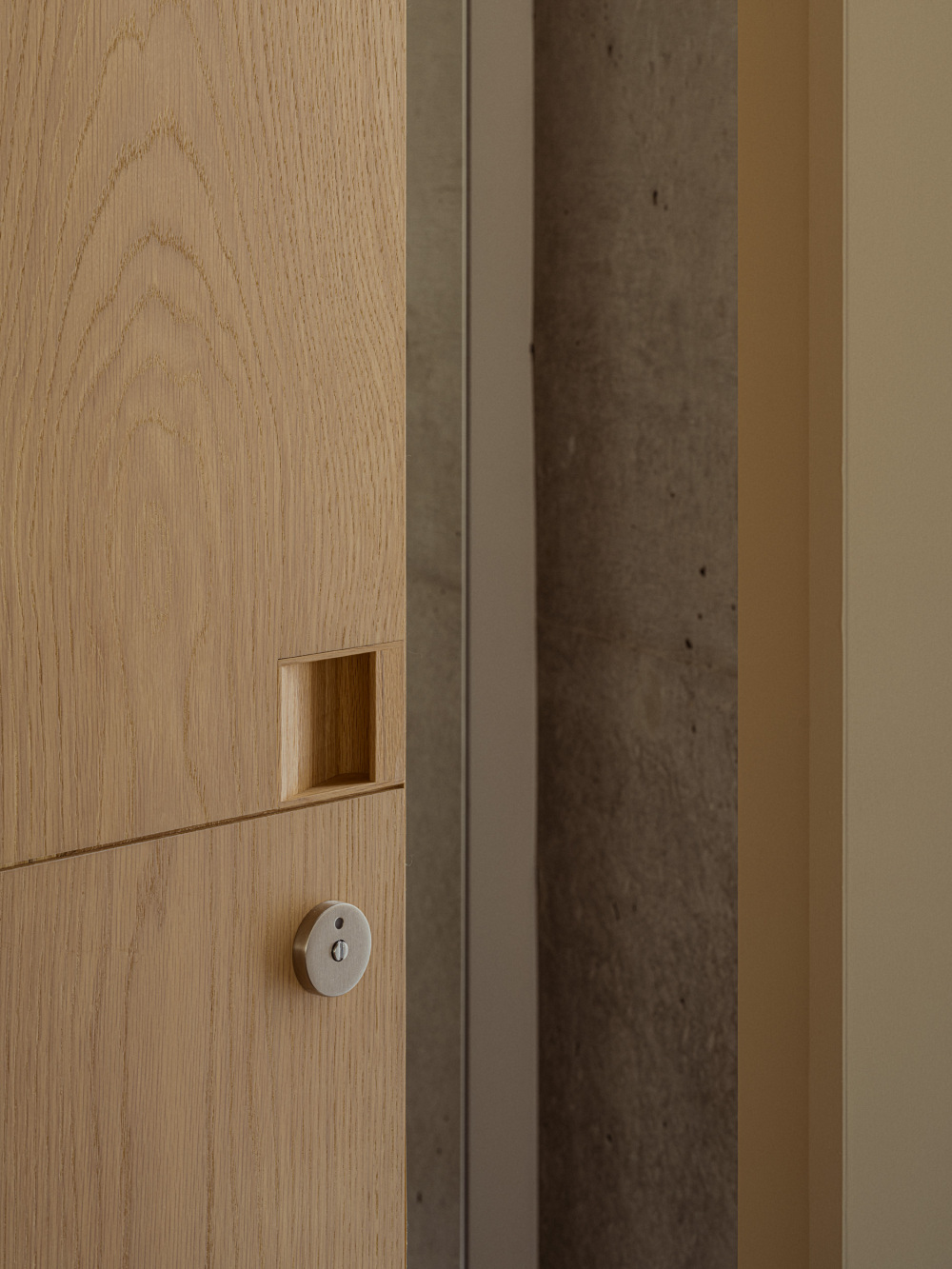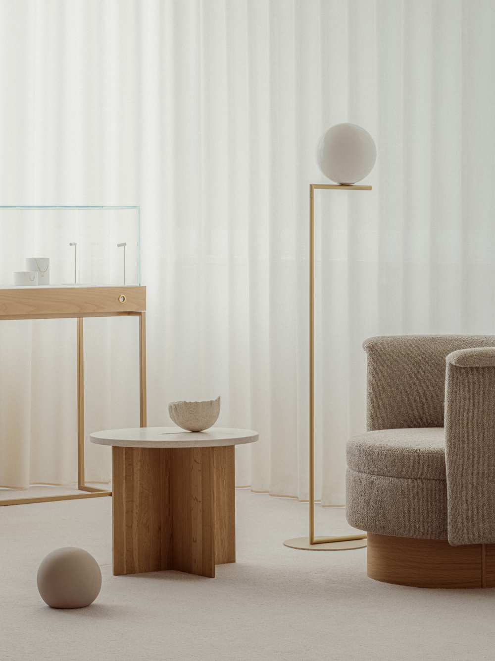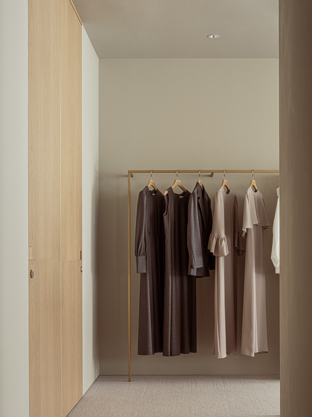 设计团队刻意减少材料的种类,仅用石膏墙、橡木、金色五金三种核心元素,通过细节的层层叠加制造丰富度:石膏墙的细腻肌理、橡木家具的手工触感、金色配件的精致光泽,三者相互衬托,反而让珠宝在宽敞的空间中更显夺目。这种「做减法」的设计,恰好贴合芦沢啓治工作室「诚实设计」的理念 —— 不依赖繁复装饰,而是让材料本身的质感说话。