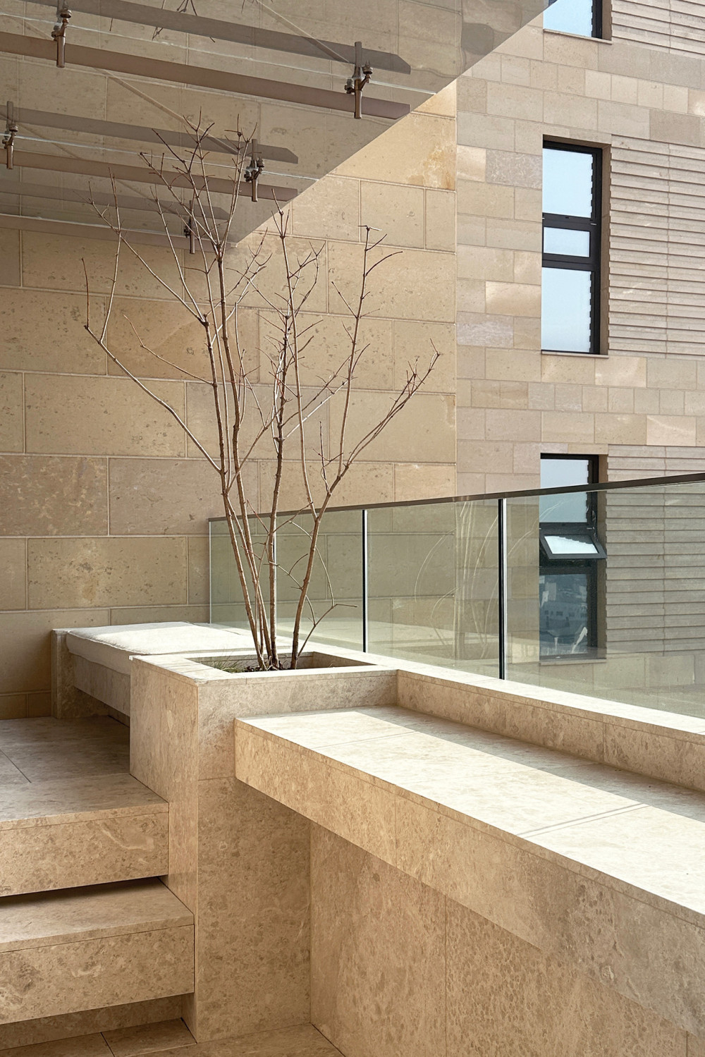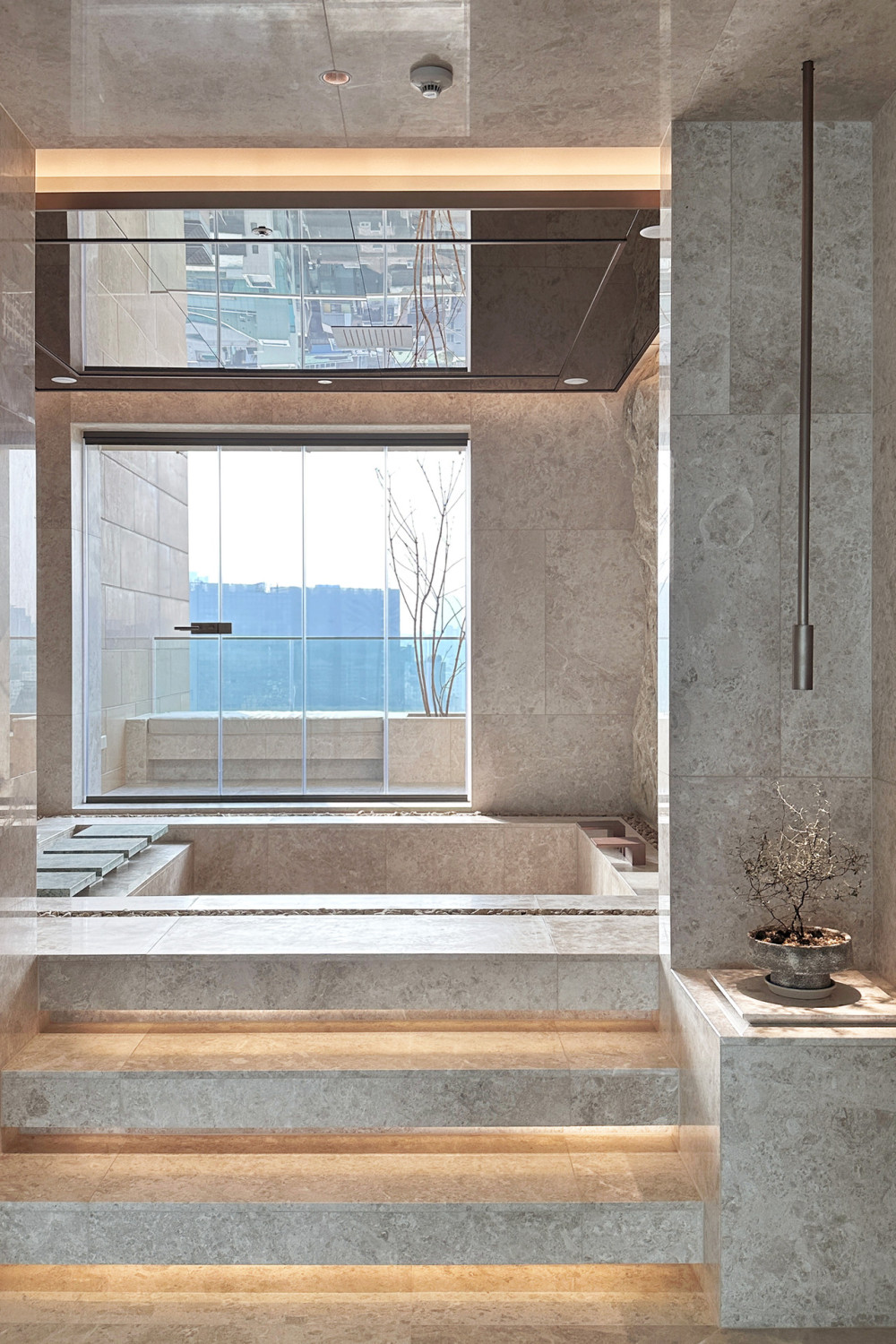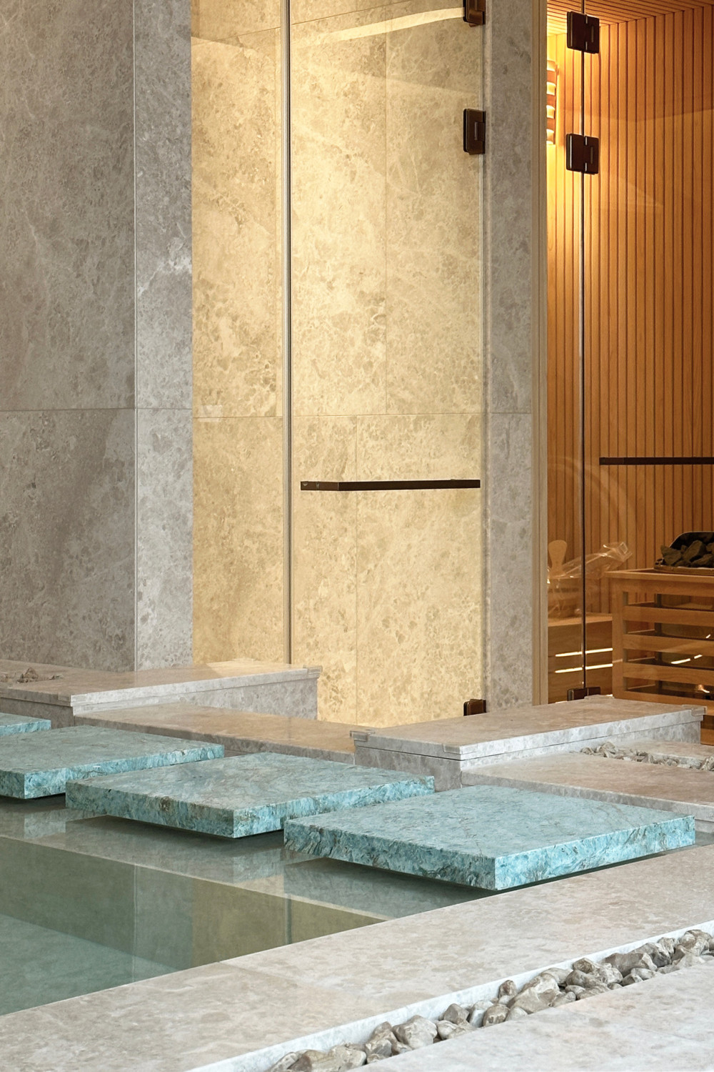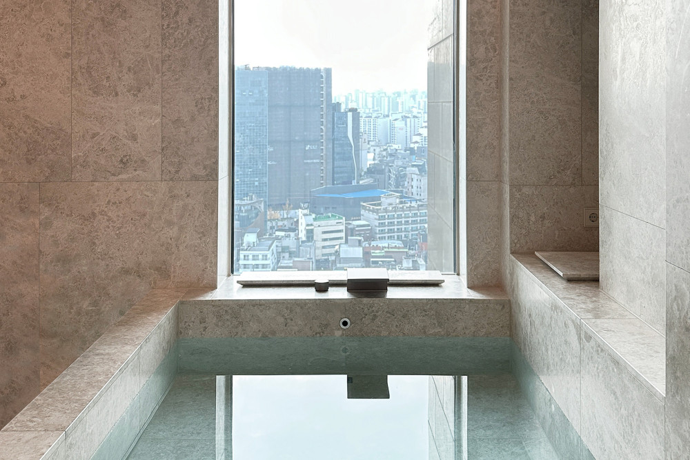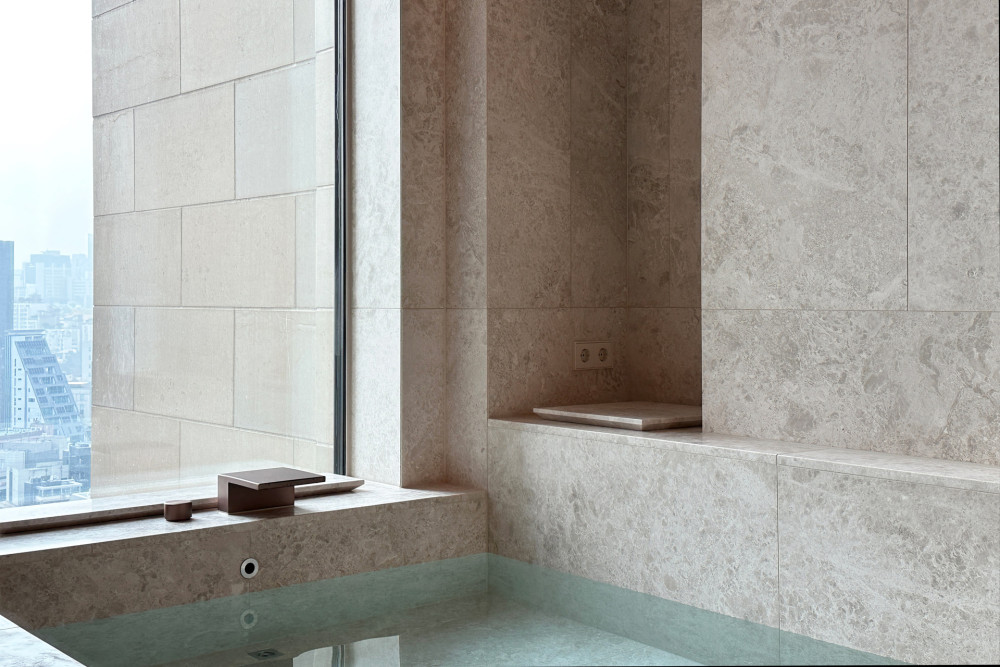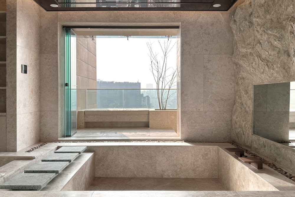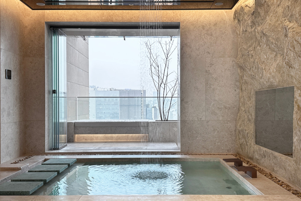 水从天花板滴落,流淌过浴池水面,连接室内与室外露台,营造出一种通感体验,模糊了内外界限,营造出市中心充满异域风情的滨水空间氛围。