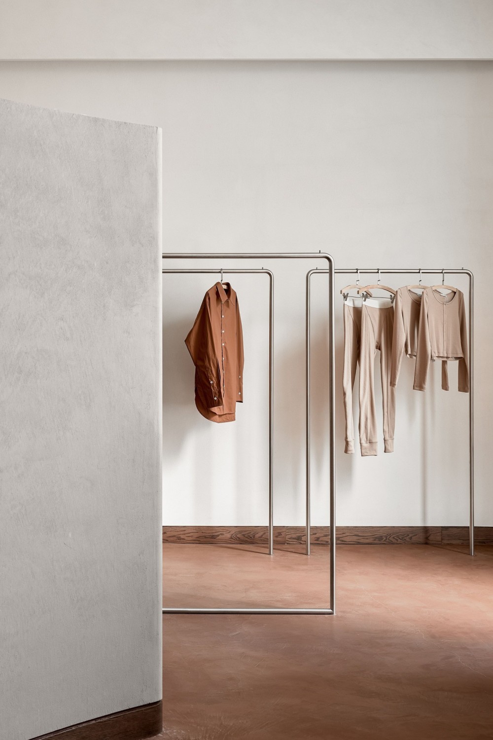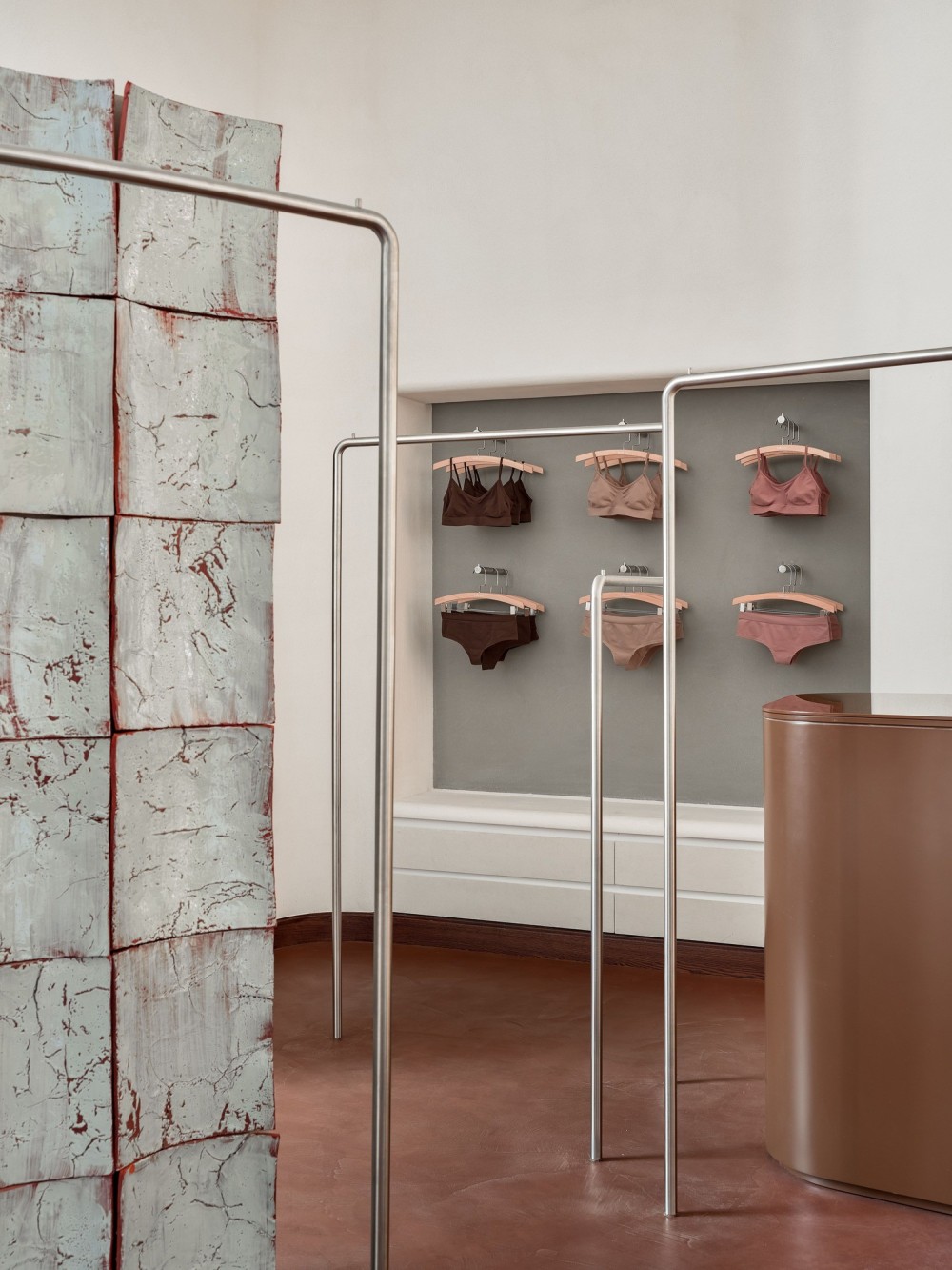 空间以赤陶、米白、浅灰构建统一的大地色系基底,既契合内衣的自然色调,又传递出 “松弛、包容” 的情绪氛围。局部的做旧赤陶色肌理(墙面、地面)与裸粉、棕褐的内衣色彩形成深浅呼应,让服饰成为空间色彩的延伸,而非突兀的陈列品。这间内衣店的设计,本质是一场 “材质与身体的对话”:它用粗粝的空间肌理托举内衣的柔软,以去符号化的展示逻辑,让私密服饰回归 “舒适、自我” 的本质 —— 在这里,“美” 不再是单一的性别标签,而是材质、形态与身体的共生。