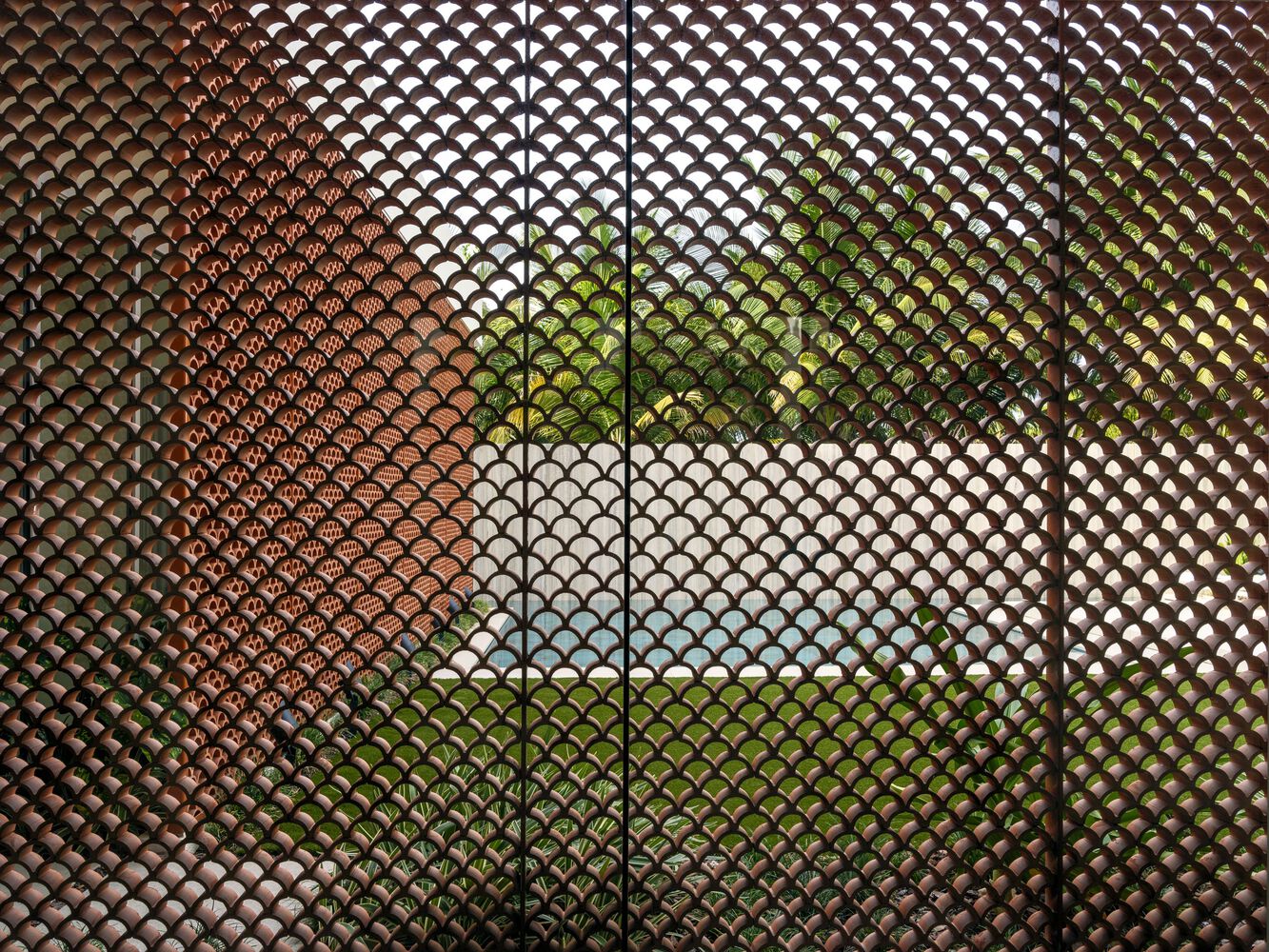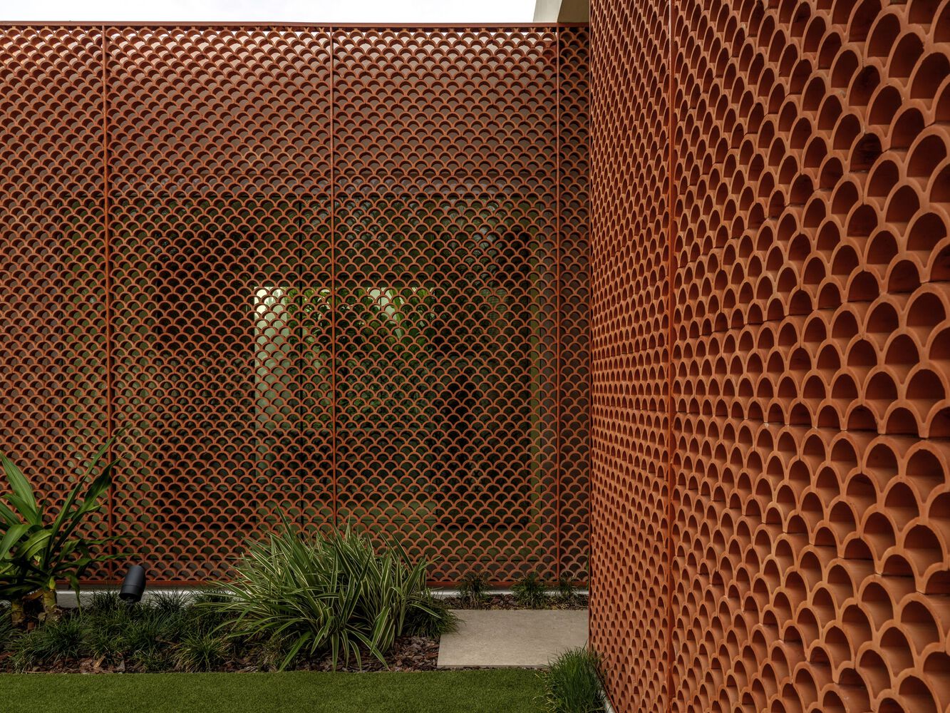 该项目的亮点之一是三块赤陶太阳能面板,长度从 5.5 米到近 10 米不等,覆盖了约 20% 的外立面。这些遮阳板带有鳞片状的切口,减少了太阳眩光,保证了隐私,并创造了有趣的深度层次感。面板与建筑之间的空间种植了茂盛的植被,加强了视觉隔离和与绿色植物的融合。到了晚上,在内部照明的映衬下,这些面板投射出的阴影为房子带来柔和的光芒,几乎就像一盏灯笼。