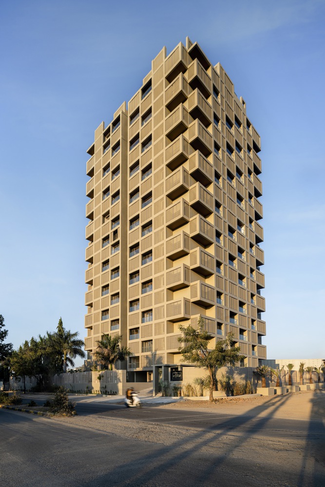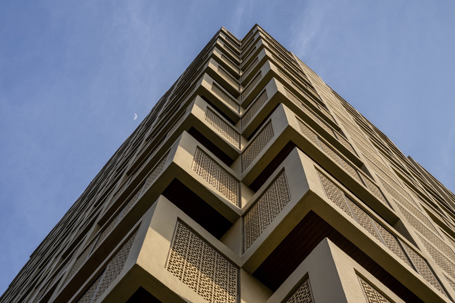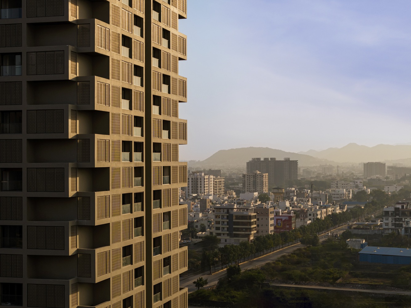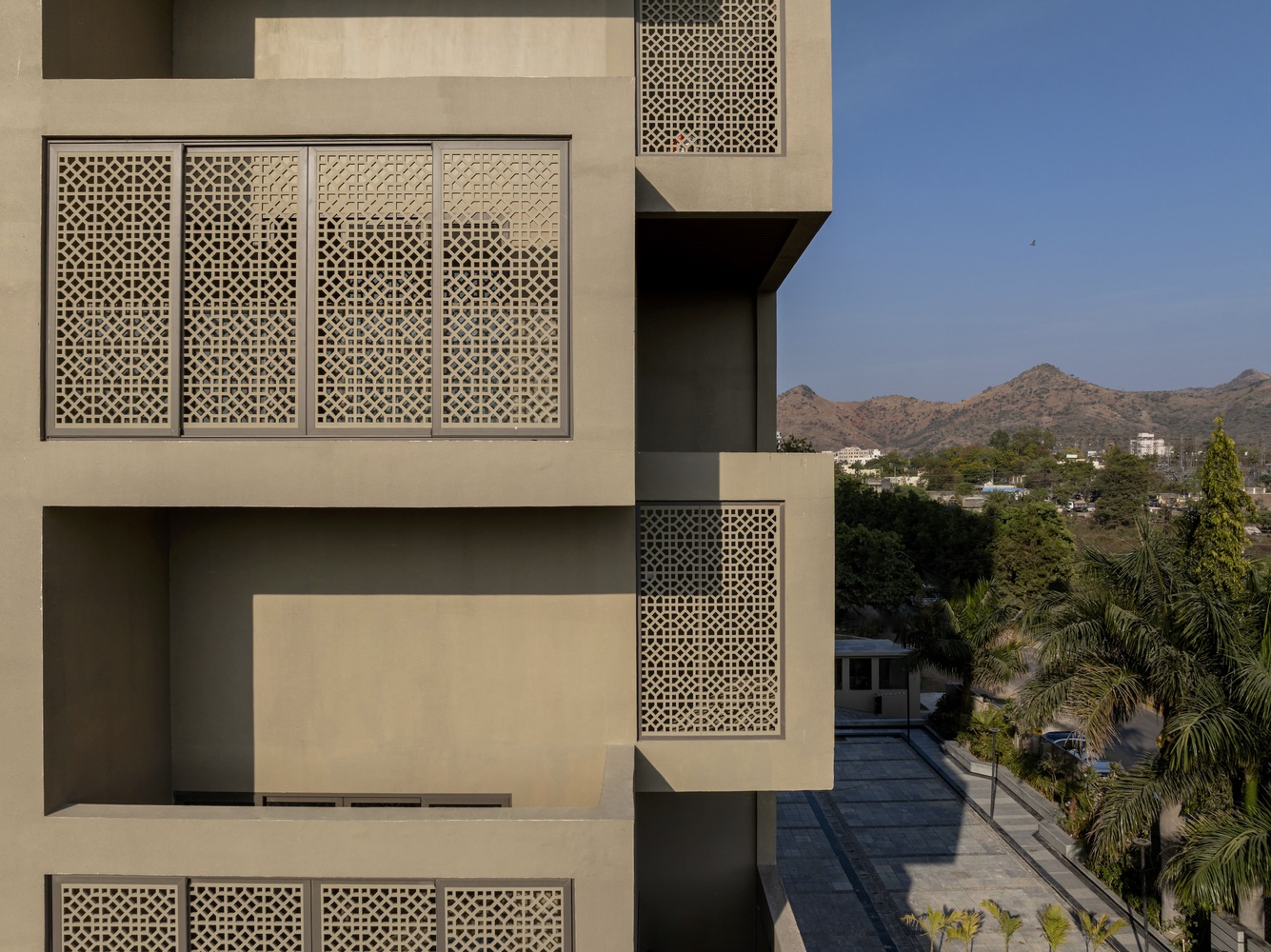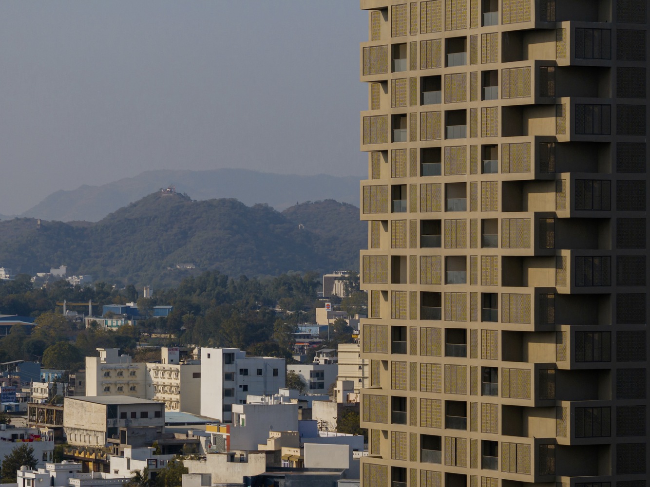 504 屏风公寓楼设计是一座 21 层的公寓建筑,位于印度拉贾斯坦邦乌代布尔,占地面积 3690 平方米,共有 78 套公寓,总建筑面积达 20000 平方米。在每一层的四个象限中,各规划了四套公寓,每套公寓都设有四间卧室和起居空间,这样的设计能让住户看到周围相邻两边的景色,并且各个方向都能远眺群山。该地区可追溯至 16 和 17 世纪的传统建筑中有许多向外突出的带屏风阳台空间的例子,这些阳台既能抵御夏季高达 35°C 至 48°C 的酷热,同时还能提供隐私保护。