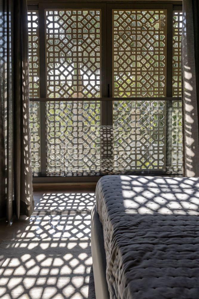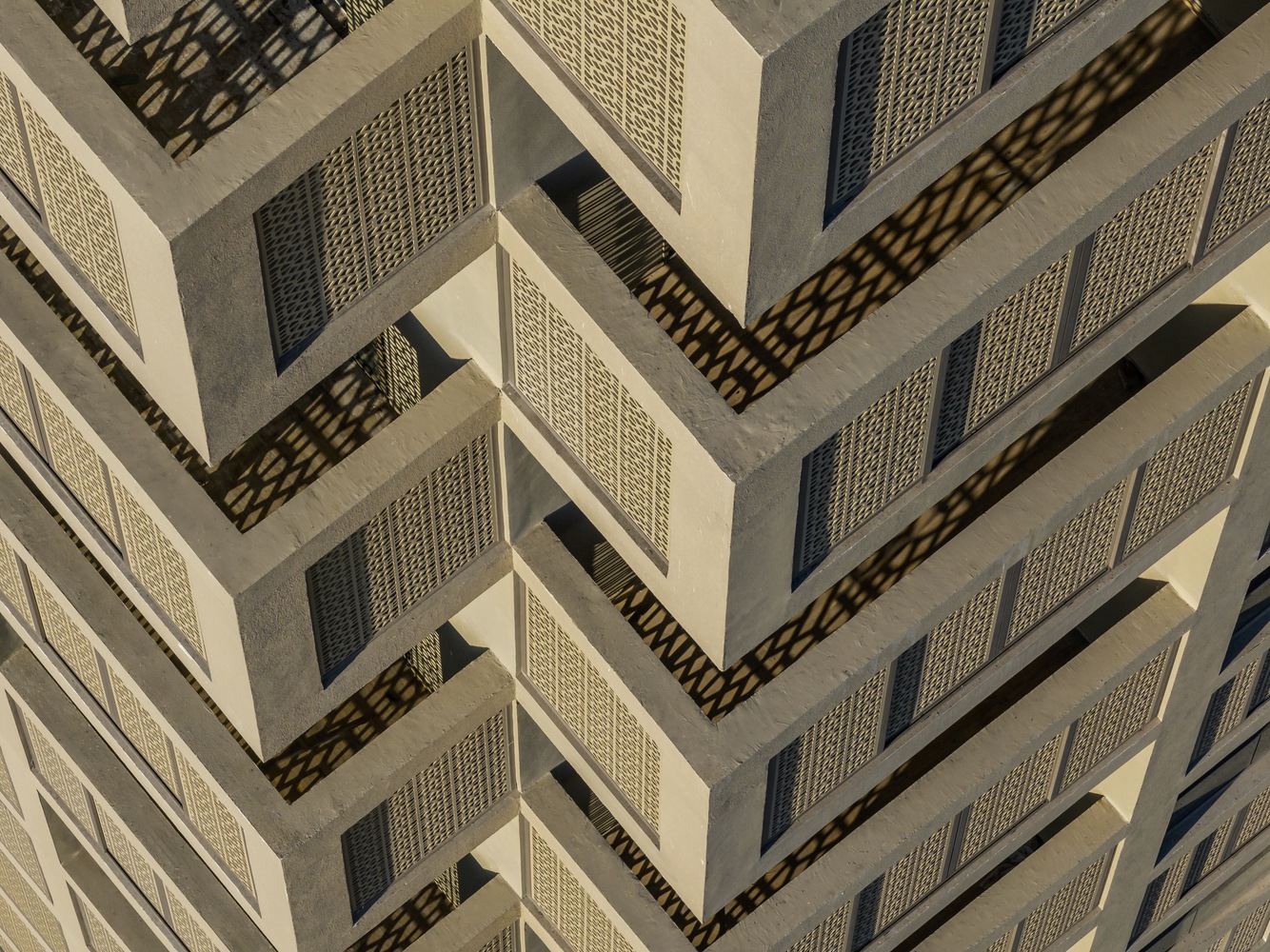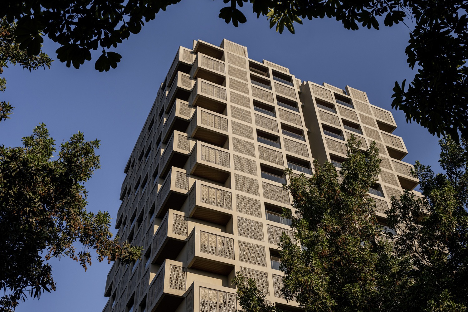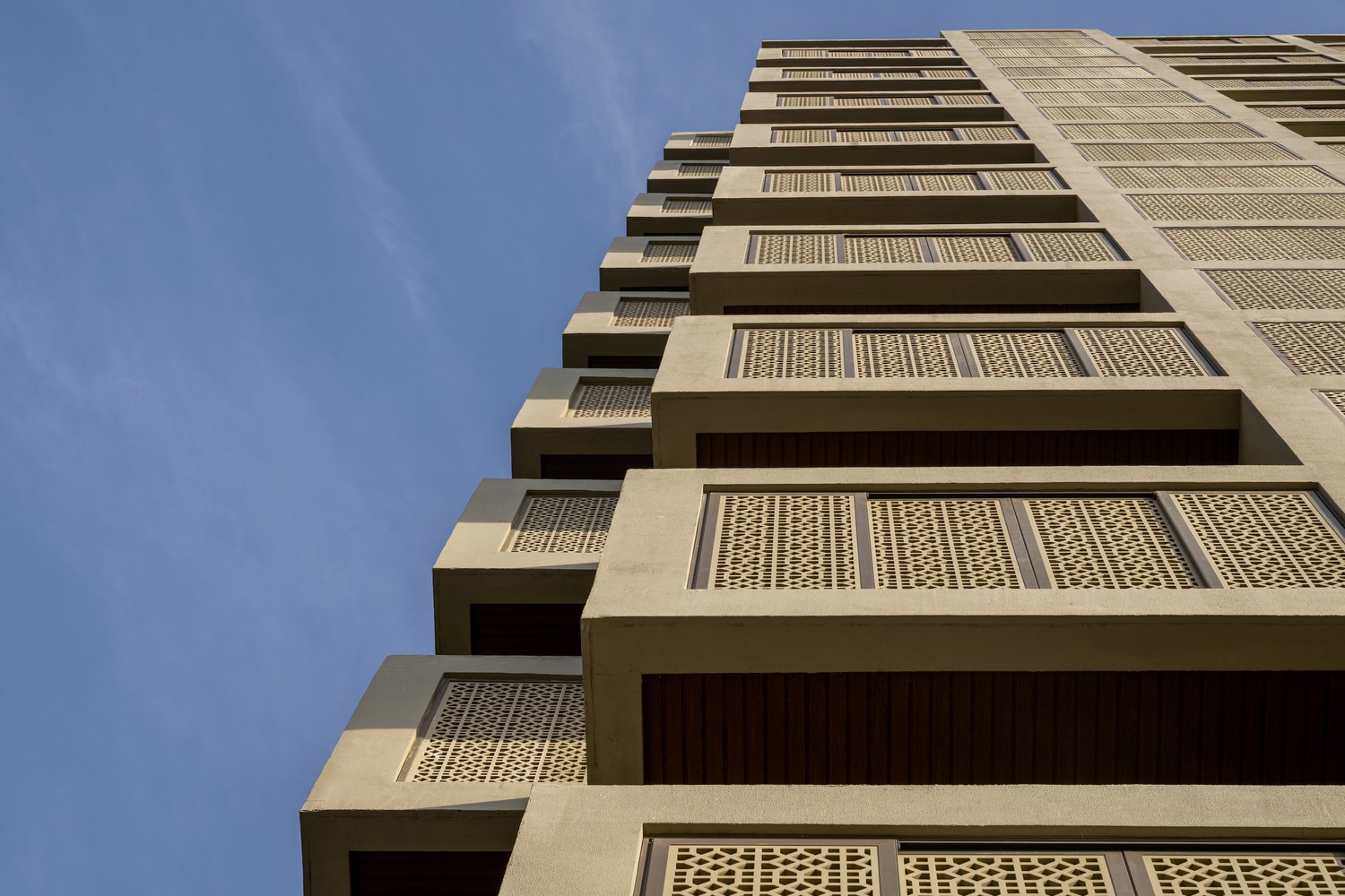受这种传统建筑元素的启发,每套公寓的每个房间前都设计了带屏风的露台和开放式露台相结合的空间,以减少热量吸收,并在室内和室外之间提供过渡空间。每套公寓在客厅和四间卧室前都设有五个阳台空间。其中一些是开放式的,一些则带有采用传统图案穿孔的滑动屏风。带屏风的露台可以部分打开。每套公寓中有一个露台高达 20 英尺。居民可以选择使用单高 10 英尺的露台或 20 英尺高的露台,根据天气情况,这些露台可以完全打开、部分打开或完全封闭。