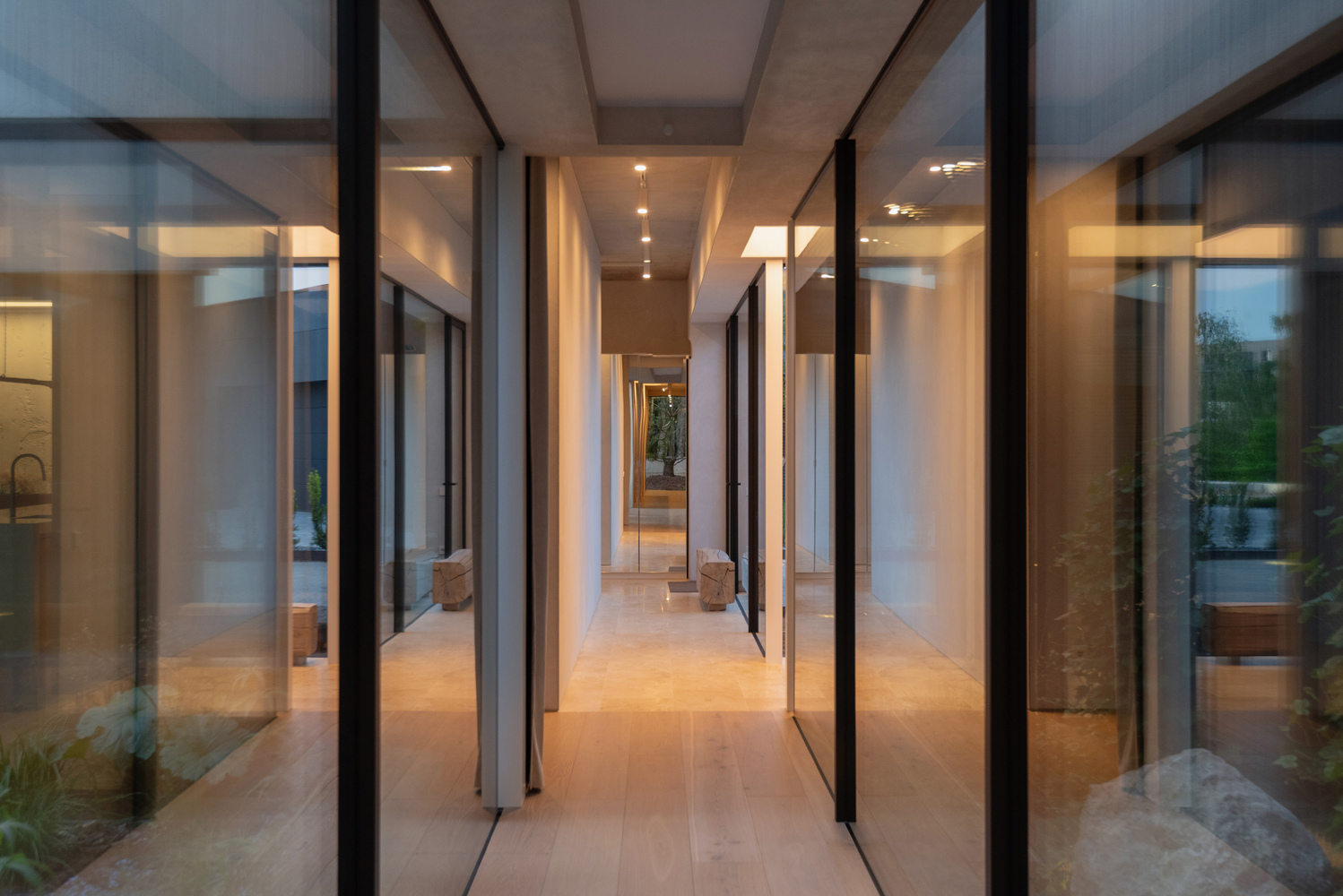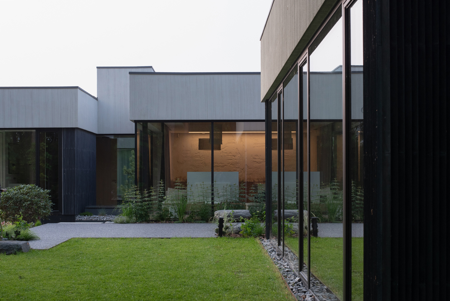 建筑的核心结构由四个相互独立的矩形体量构成,通过走廊连接;这些体量以不规则多边形的形态排布,围合出一个内庭院,使其成为住宅真正的 “心脏”。内庭院配有宽阔露台,在温暖季节成为家庭生活的主要活动场 —— 既能抵御风力、隔绝邻居视线,又完全向阳光与天空敞开。