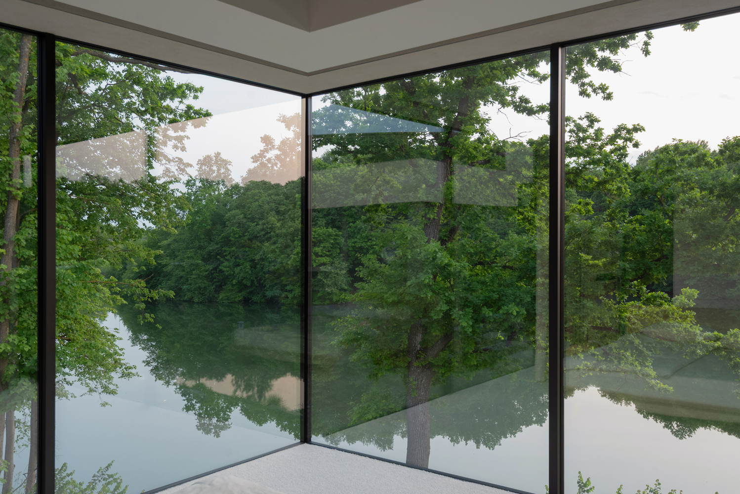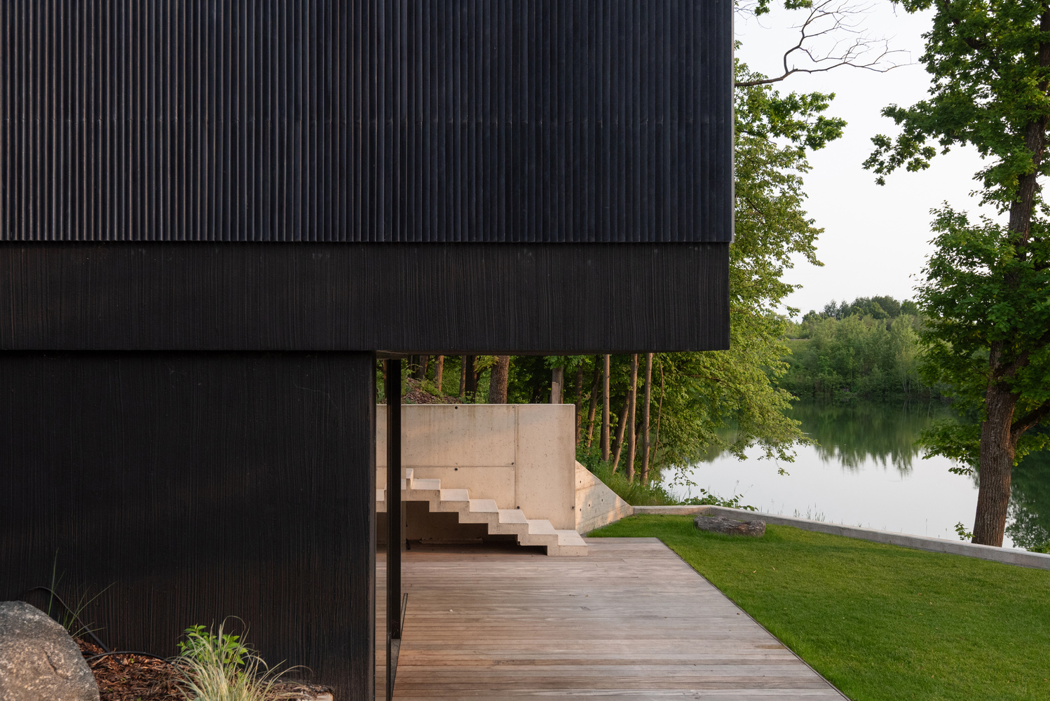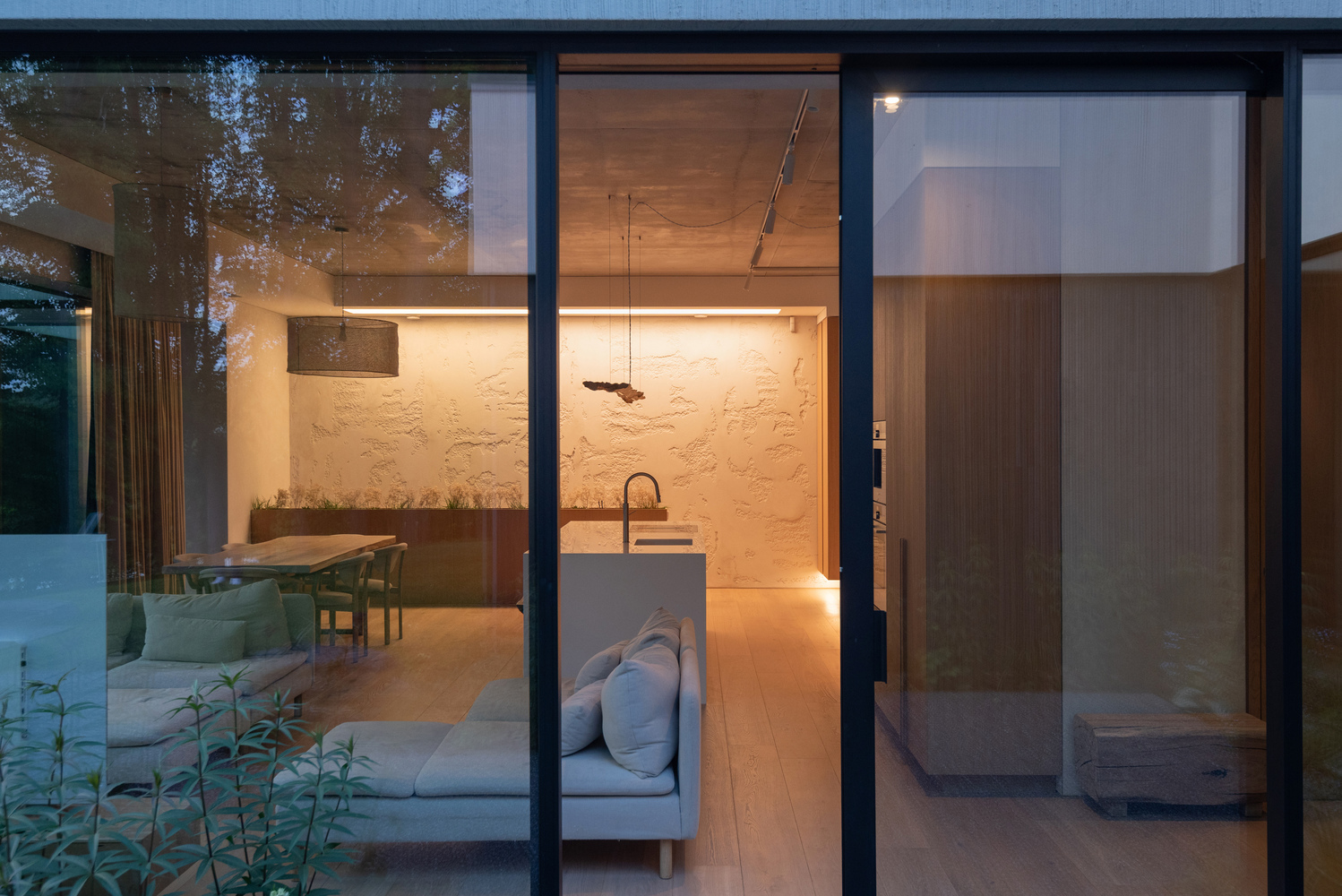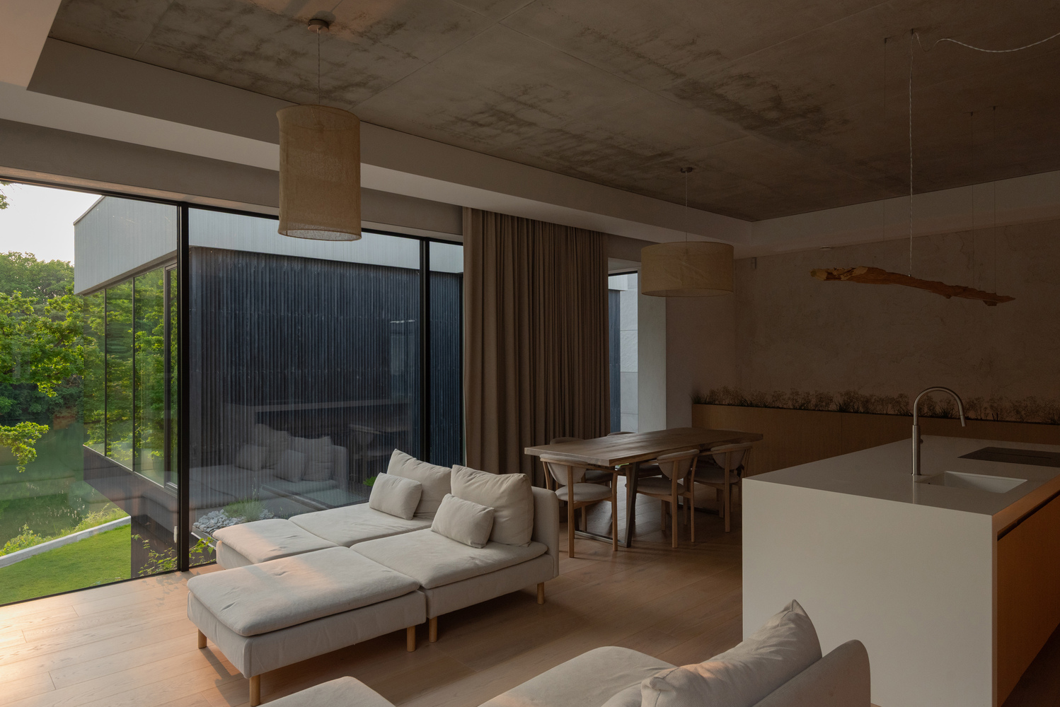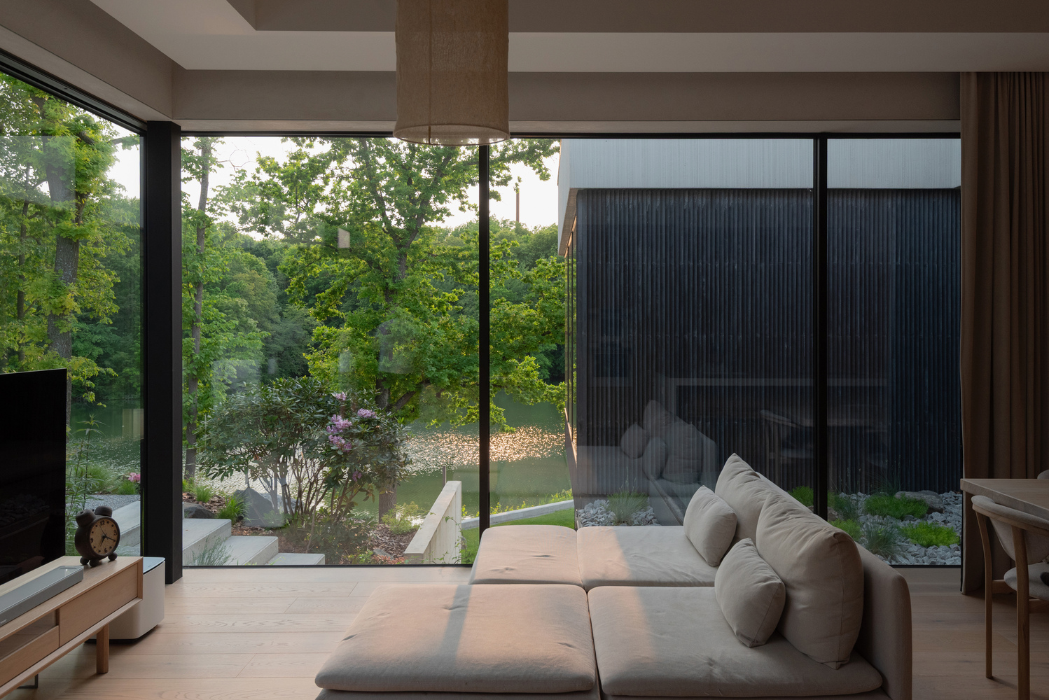 正是在这里,住宅的 “真实面貌” 得以展现:若说面向街道的立面内敛克制,那么内庭院与湖畔一侧的立面则完全相反。从地面延伸至屋顶的铝制落地窗,彻底消弭了室内外的边界。客厅、餐厅与厨房与露台无缝融合,而湖畔全景则成为室内的动态背景,随四季更迭变换景致。