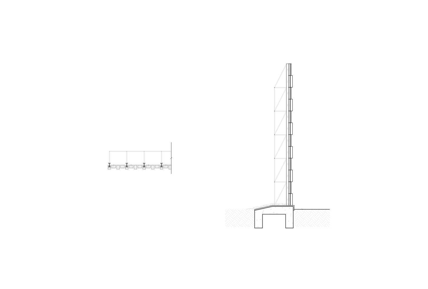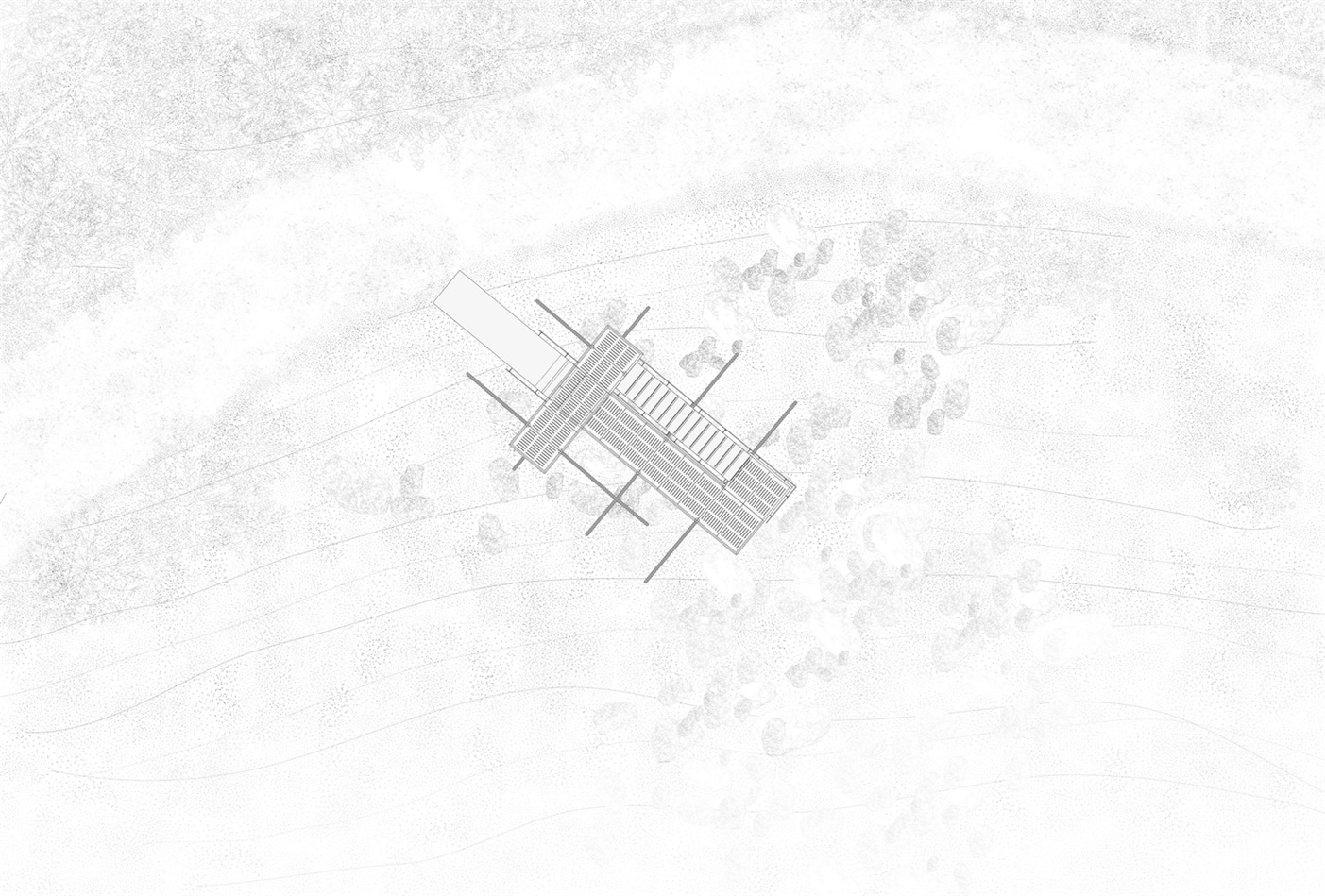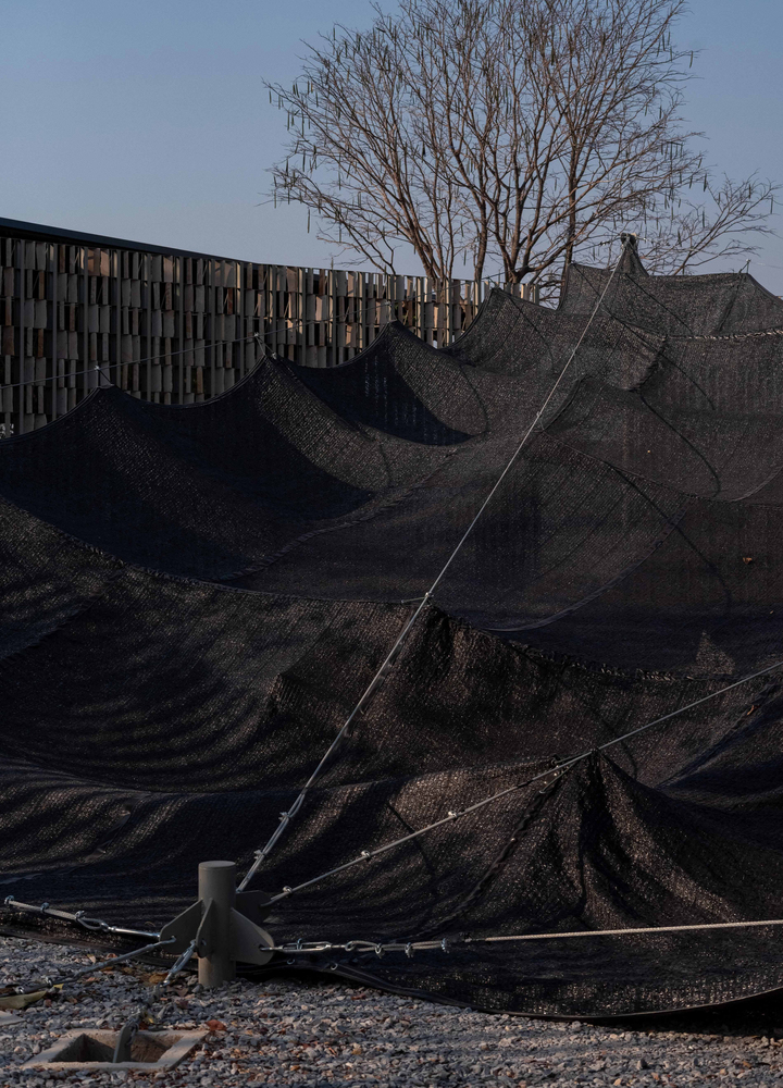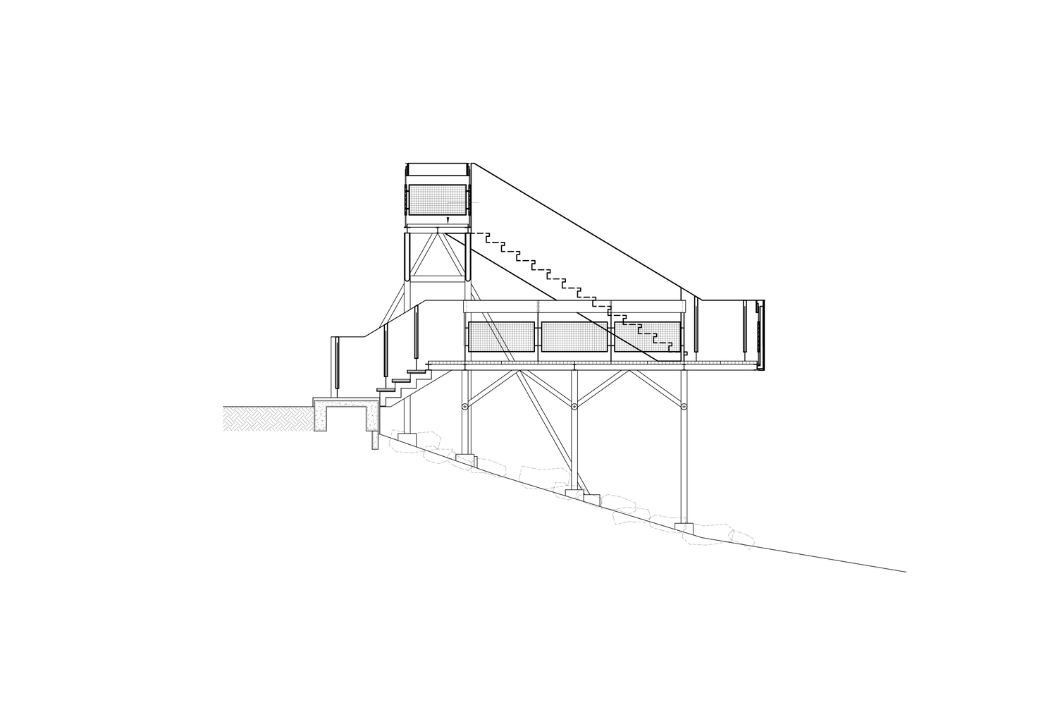 沿着山坡向上,游客会到达 1 号休息站,这是一个半封闭的休息空间,由轻质且适应性强的材料(如遮阳网)建造而成。休息站位于温室上方,提供了一个安静的休憩之地,可欣赏开阔的全景。