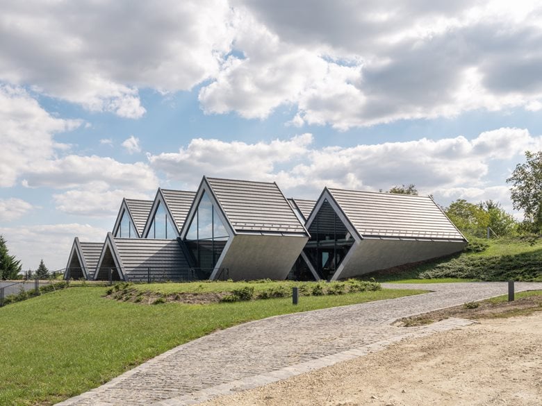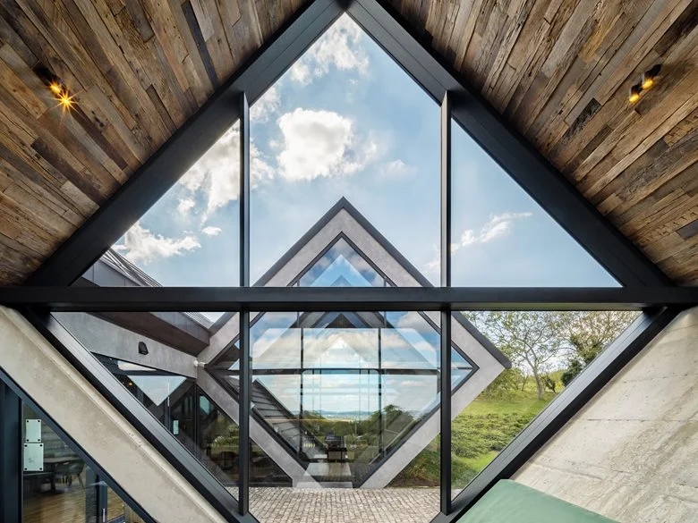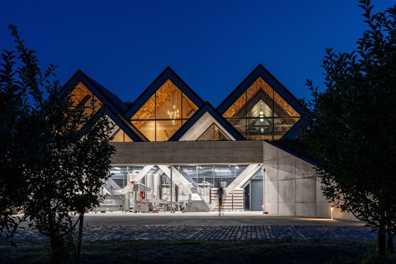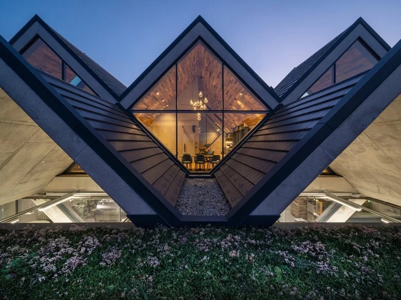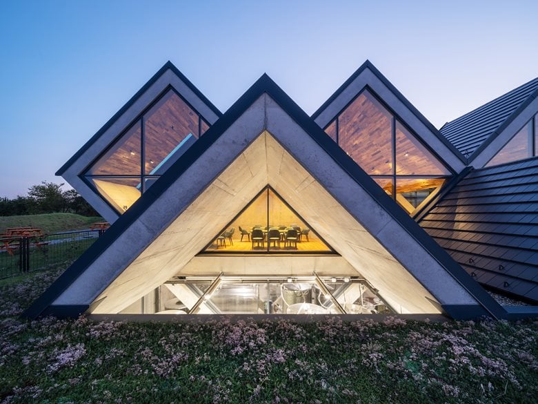 设计团队以传统 45 度双坡屋顶的几何形态为基础,通过水平镜像确定建筑体量的基本单元;随后将这些单元进行水平与垂直方向的偏移、依次排列,最终构成完整的建筑体量。建筑沿坡地东北侧的斜坡轴线排布,部分嵌入地下。其两端的菱形 “通道空间” 采用玻璃幕墙围合,使室内与园内苹果树及周边景致形成视觉联结。
