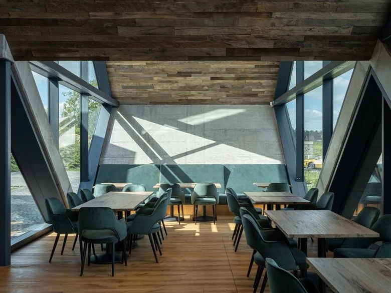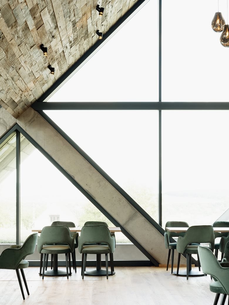 宾客区与办公区:以清水混凝土、木材、铝材与玻璃为主要材质。斜坡天花板的底面采用双层板条框架固定的复古木质饰面板 —— 这些饰面板均来自待拆除农舍的结构构件,属于回收再利用材料。符合瑞典工艺标准的地板与融入几何形态的定制木质镶板,共同为室内空间营造出温暖氛围。