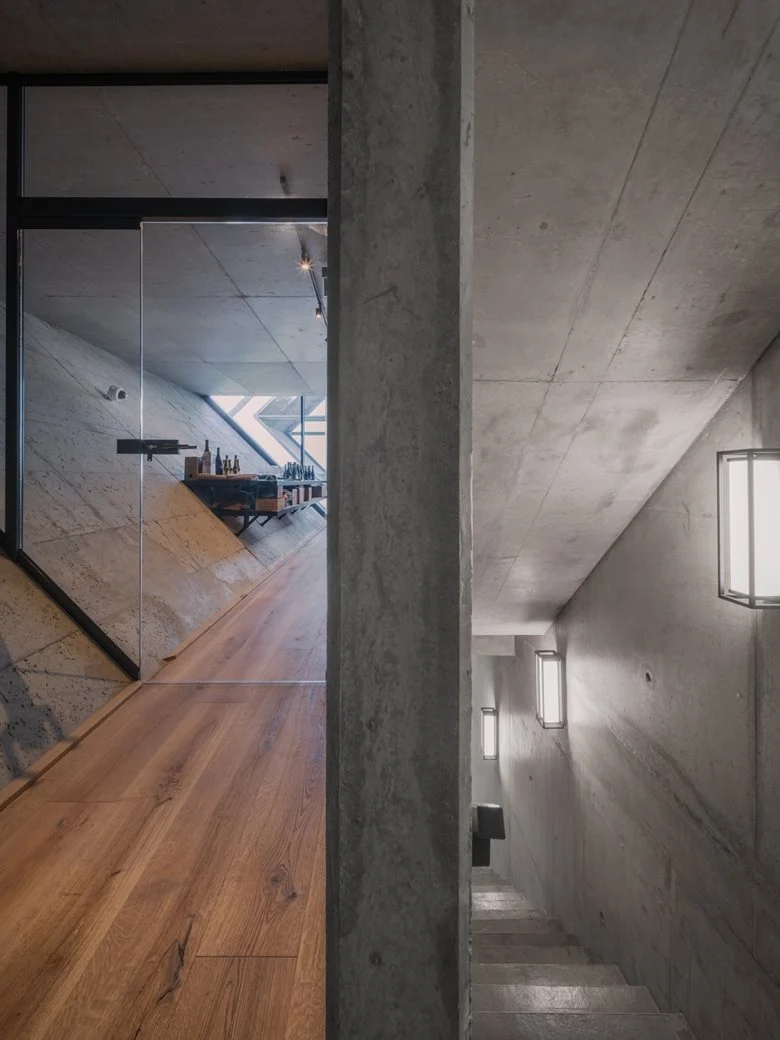 中间层(服务层):包含宾客活动区、酒吧、接待台与展示厅,可俯瞰全景。钢筋混凝土结构让空间得以实现 “无吊顶、无隔墙” 的通透视觉效果 —— 从宾客区既能望见庭院,也能看到酒桶与酒瓶,还可瞥见花园与开阔天空。不同尺寸、形态的高挑空空间相互交融,同时将独特的几何美学展现得淋漓尽致。