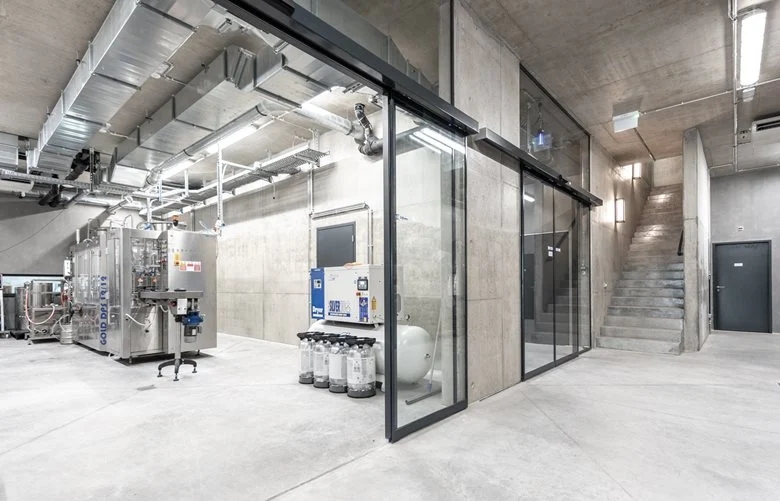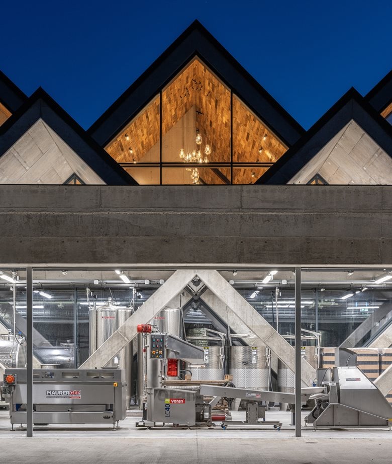 定义建筑外观的材质包括:矩形无烟煤色瓷砖、直立锁边金属板屋顶、灰泥墙面、铝制门窗与幕墙,以及现代工艺设备偶尔闪现的金属光泽。室内设计同样遵循整体建筑理念:工业功能区:以实用性为核心,裸露的工业设备、混凝土结构构件与树脂地面直观呈现功能性美学。