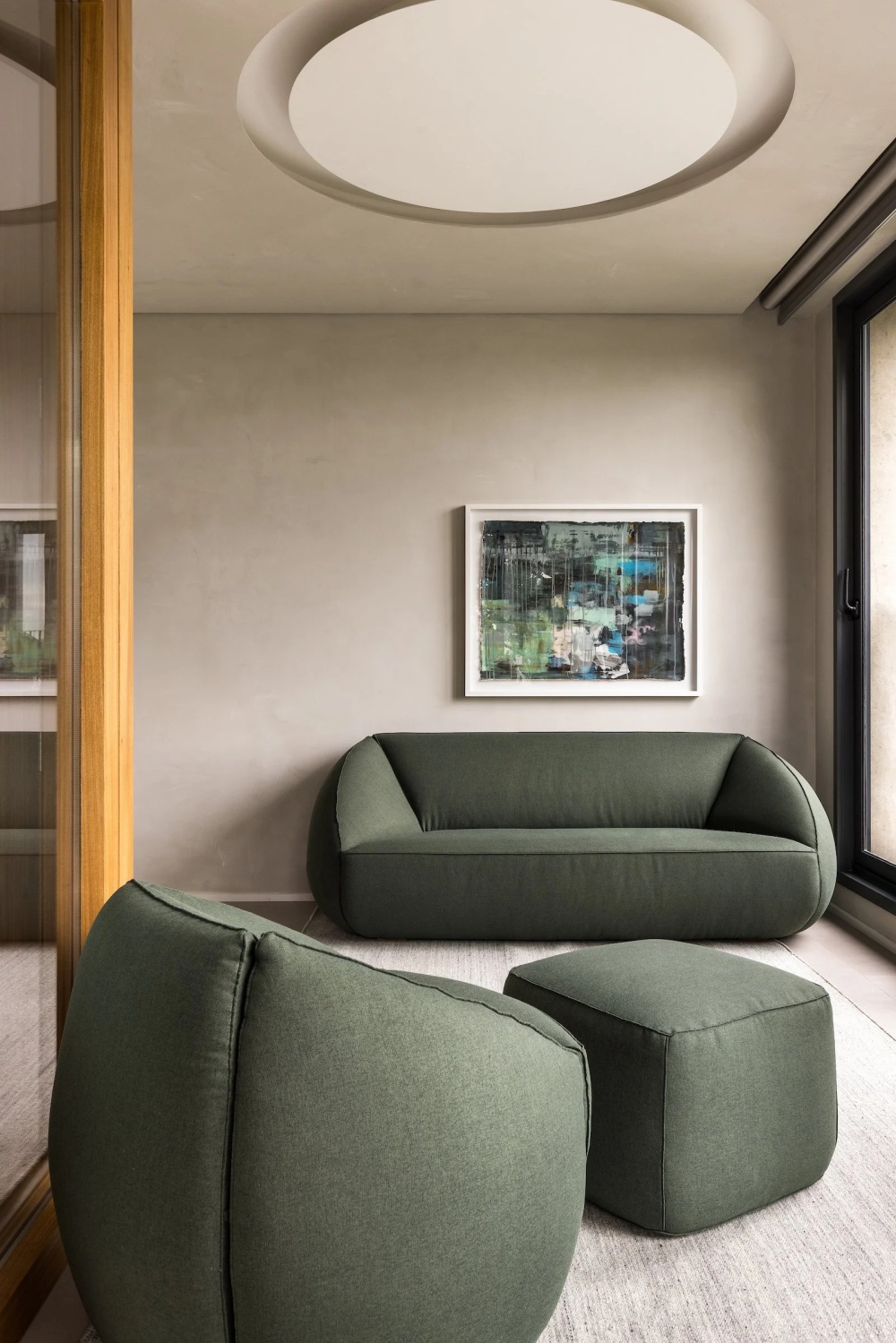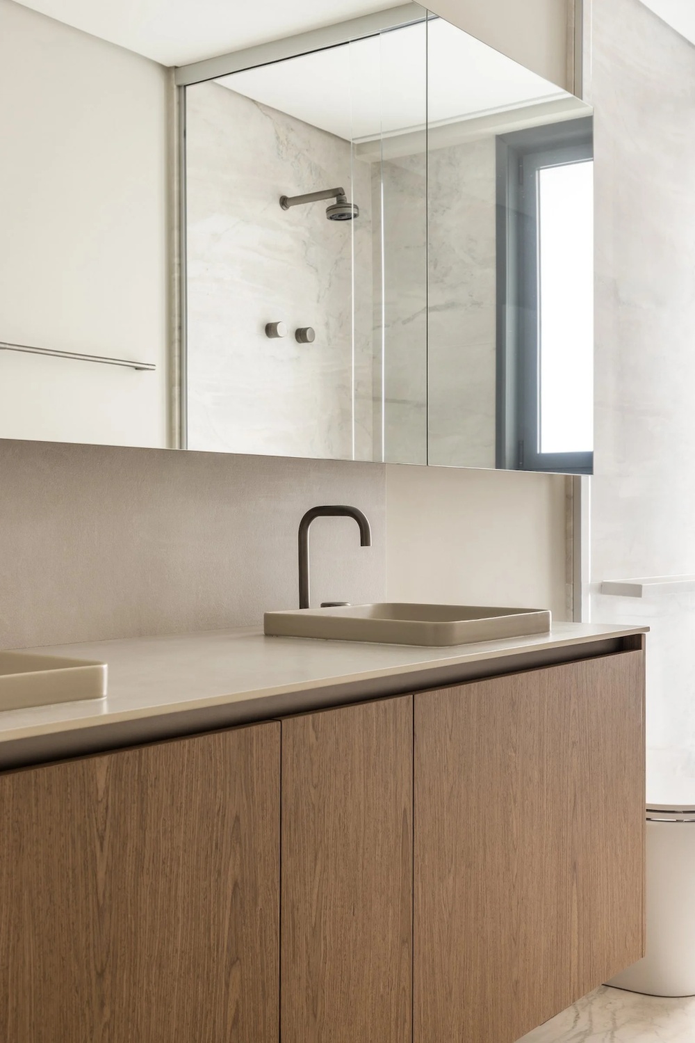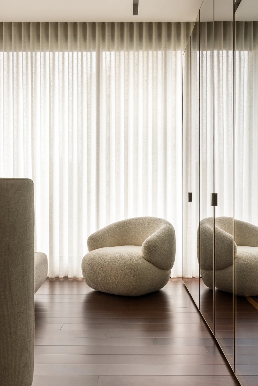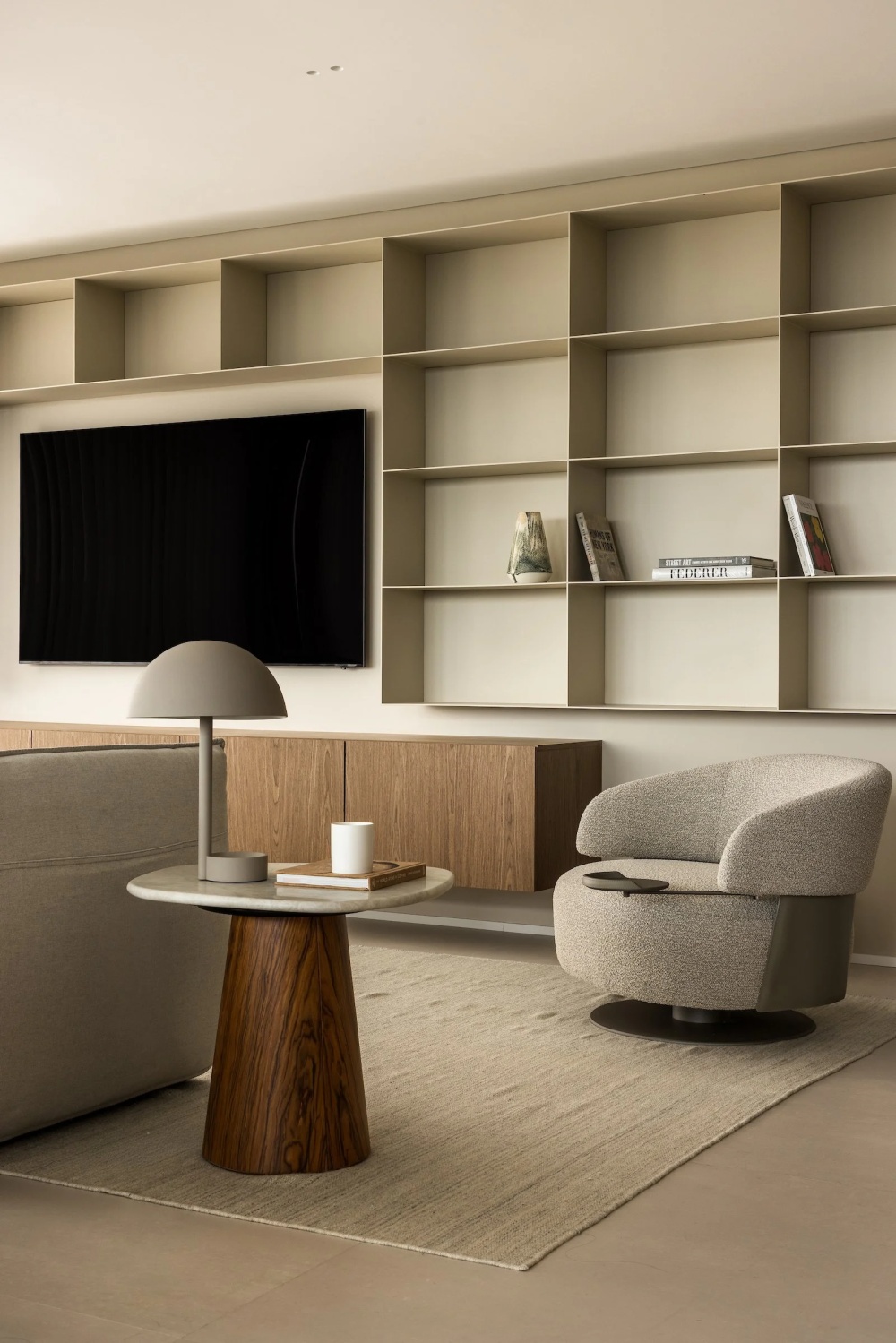 私密区域的质感延续:卧室墙面采用浅米色织物硬包,与木饰面柜体形成 “软 – 硬” 质感过渡;卫浴空间以木饰面柜体现身,搭配浅灰色大理石墙面,保持与公共空间的材质呼应,避免气质割裂。微空间的功能复合:玄关嵌入悬浮式鞋柜与挂钩墙,以 “小尺度集成” 实现高效收纳;客厅边角的弧形沙发区,通过地毯与低矮边几构建独立休闲场景,既不占用额外空间,又丰富生活的松弛感。