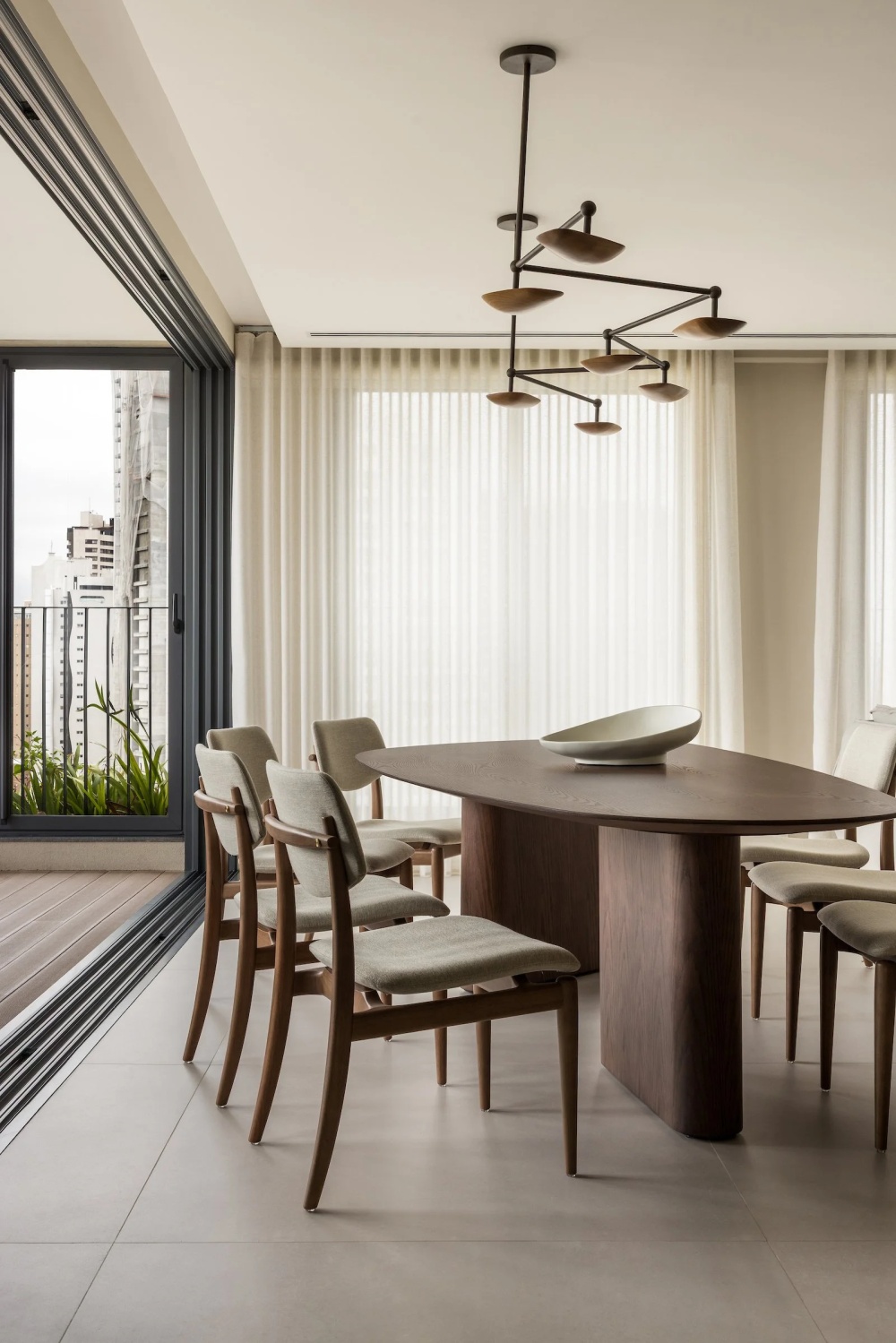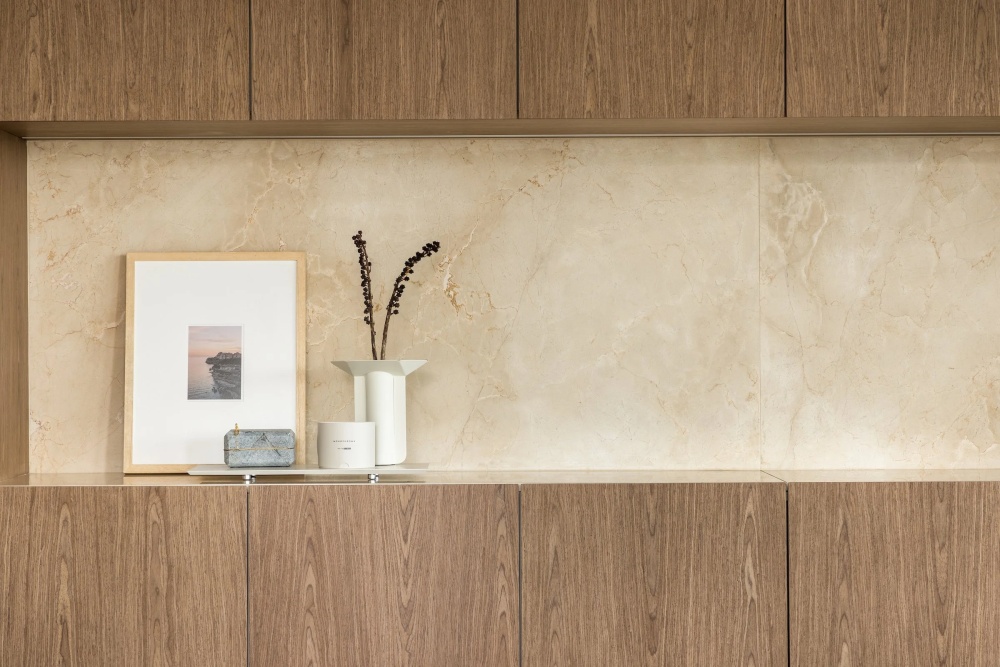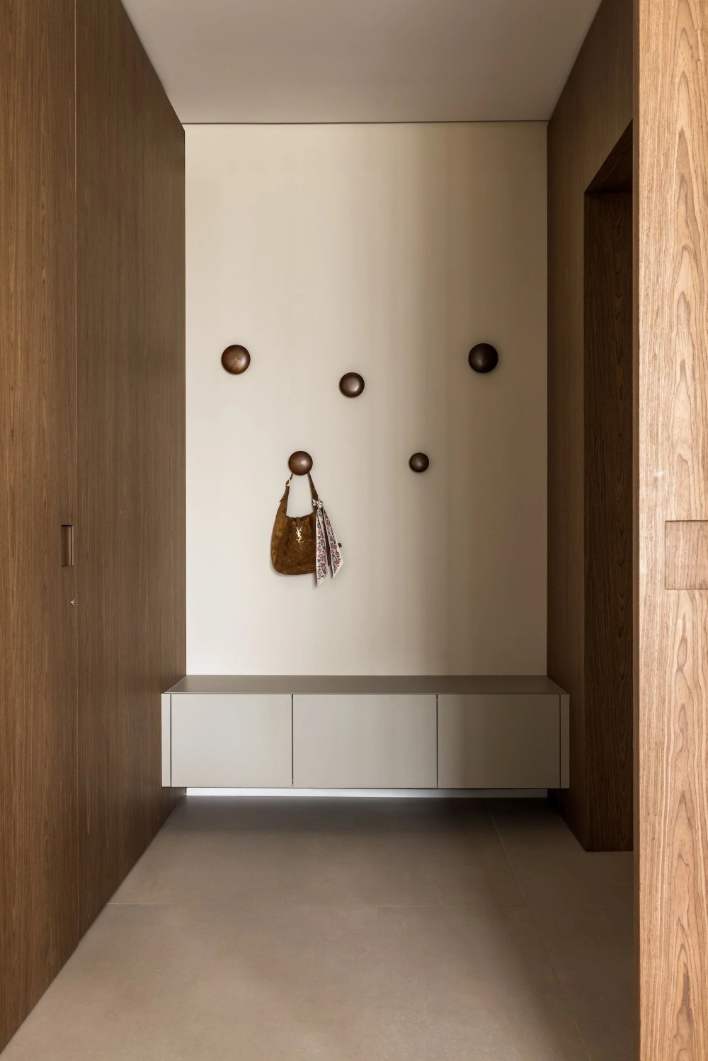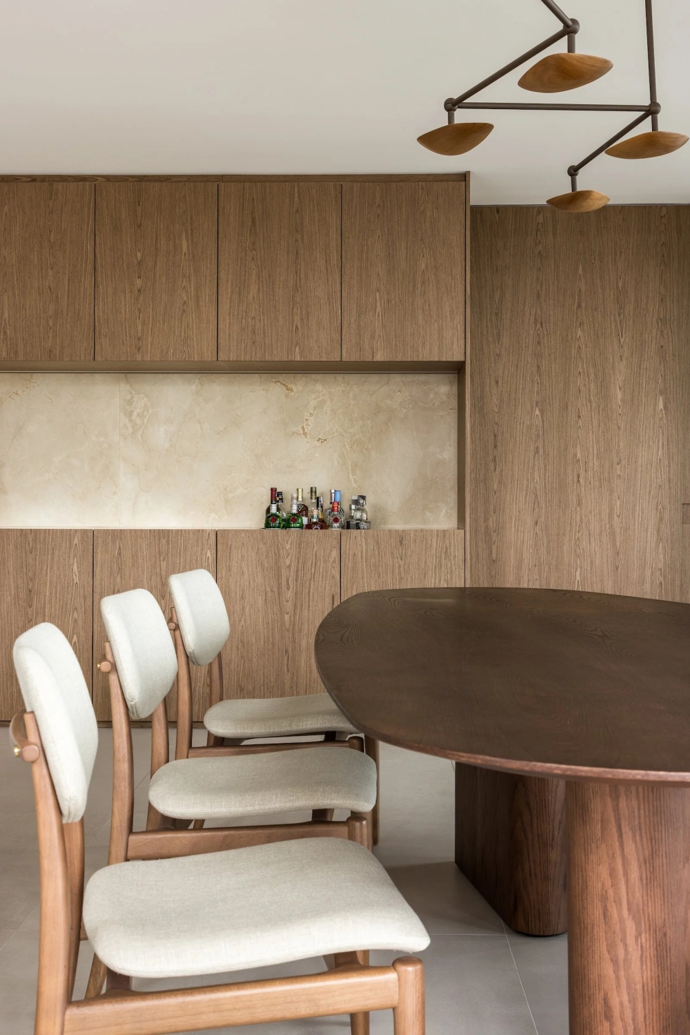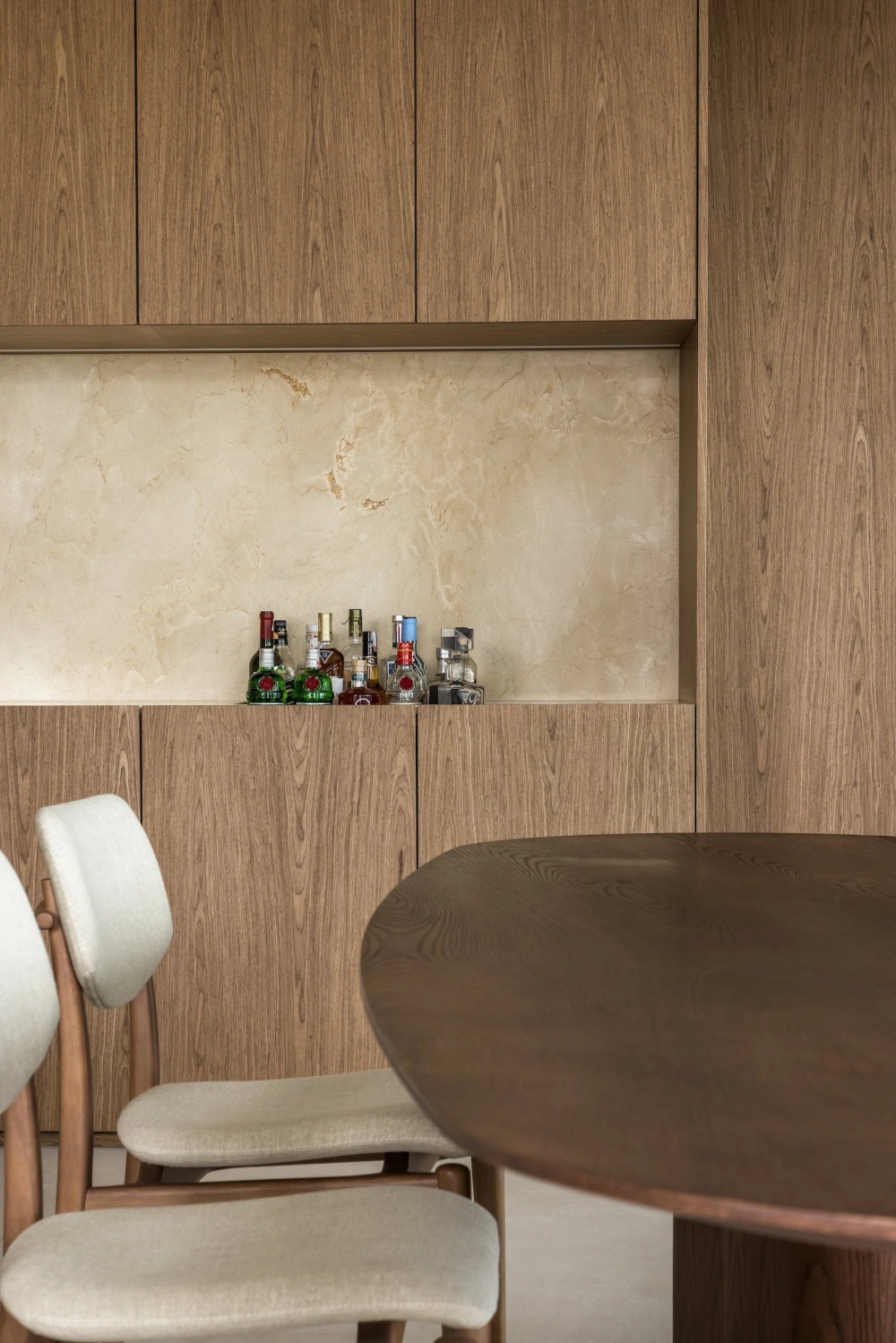 设计以橡木 / 胡桃木为核心材质基底,通过 “同材质不同肌理、异材质温和碰撞” 的策略,避免单一木色的沉闷感,让自然质感成为空间的隐性主角。木材质的层次化表达:从客厅浅橡木饰面柜体,到餐厅深胡桃木餐桌,木色呈现自然深浅渐变 —— 既保持整体调性统一,又通过色彩差异界定功能区域;墙面与柜体采用竖向拼接木纹,延伸空间纵深感;桌面、台面保留木材原生纹理与自然结疤,每一处细节都带着 “手工温度”。温和的材质碰撞:米黄色大理石(餐厨背景墙)以细腻肌理中和木材质的厚重;浅灰色微水泥地面以哑光质感铺垫柔和基底;金属元素以 “轻量级” 形式出现 —— 玄关铜色挂钩、餐厅深色金属框架吊灯,以精致线条强化现代感,却不破坏木调空间的温润氛围。