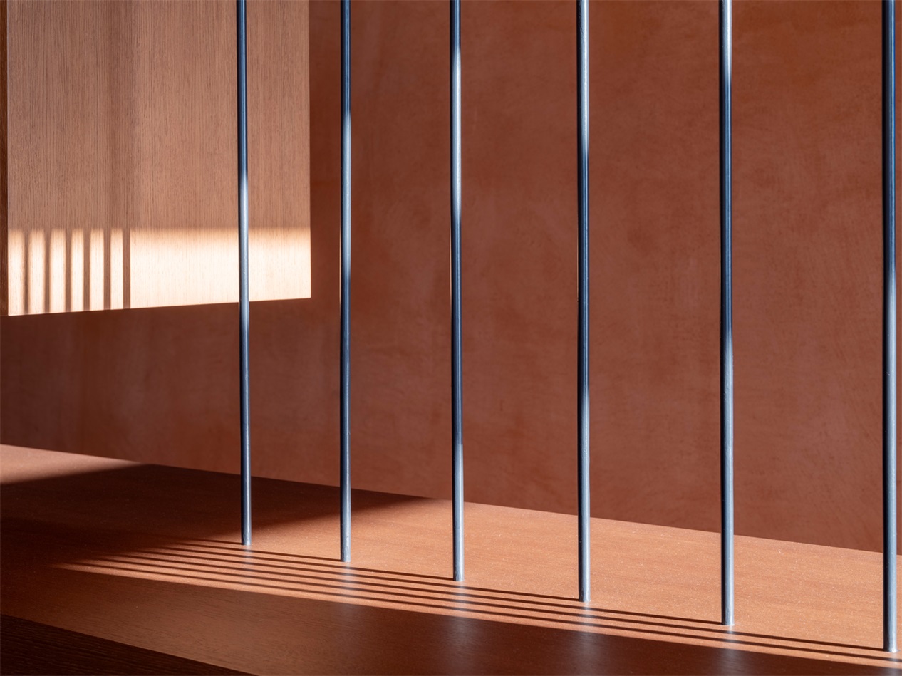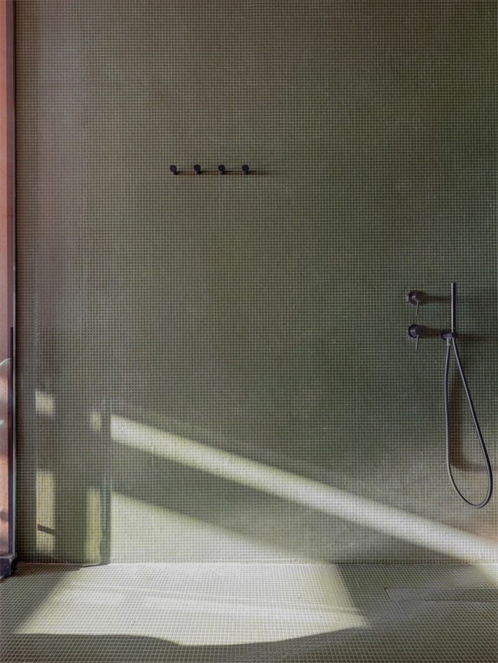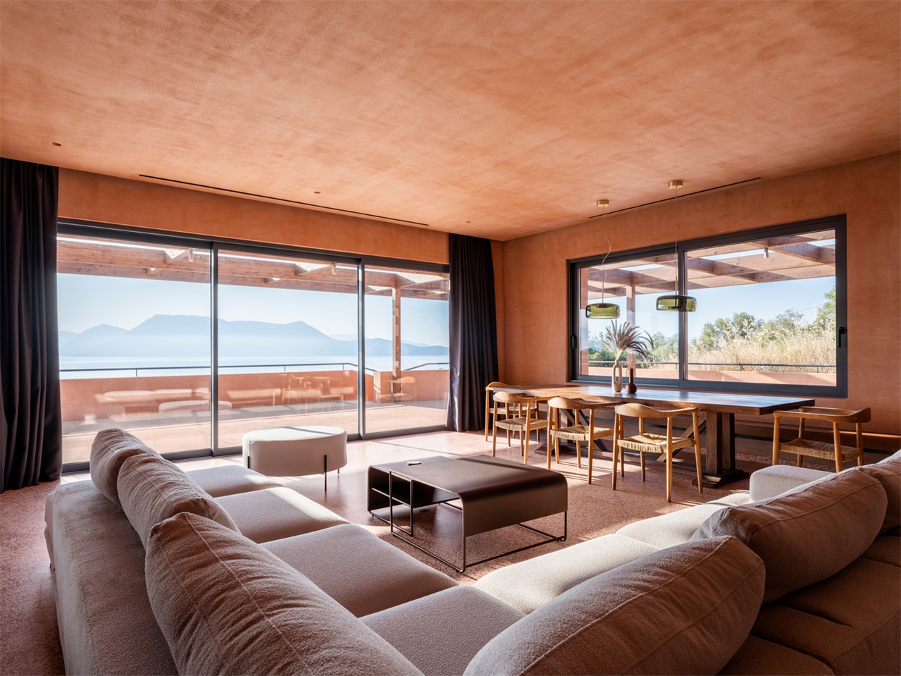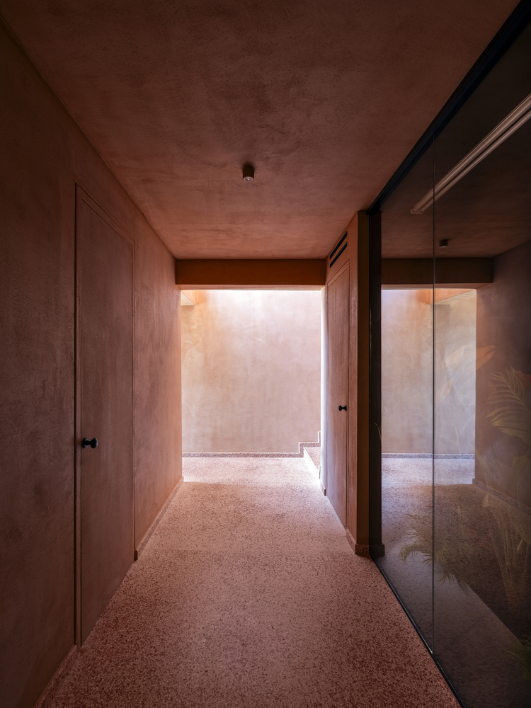 温暖的赤陶色调与自然景观相呼应,营造出一种仿佛被地球环抱的空间感,宛如从大地本身雕琢而出。质朴的纹理 —— 手工水磨石、大理石和木材 —— 统一应用于墙壁、地板和天花板,共同打造出理想的夏季住宅环境。