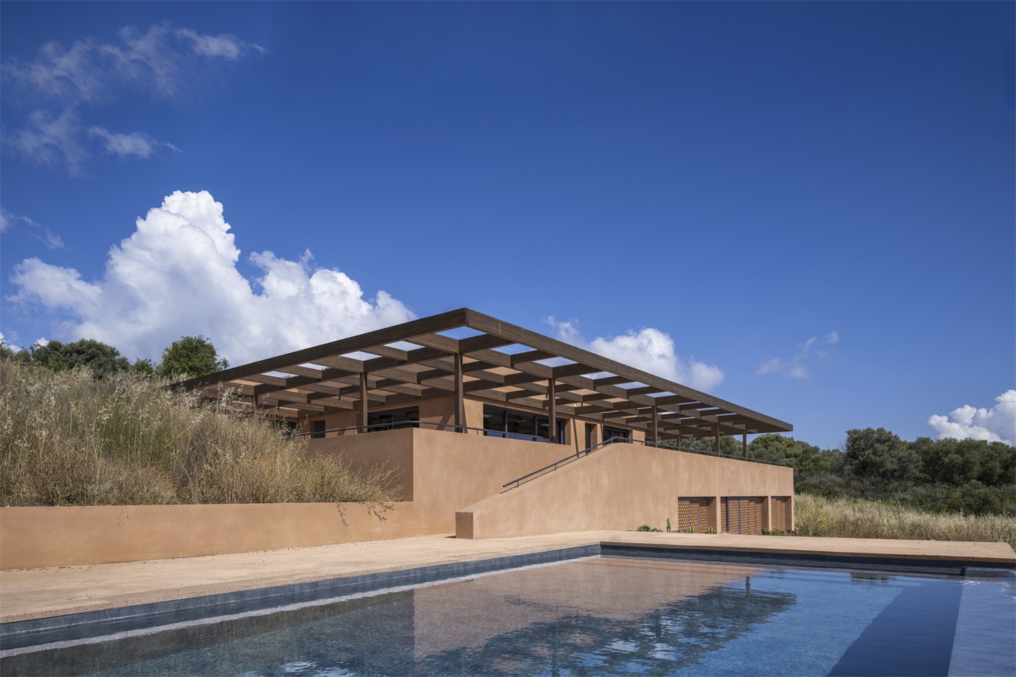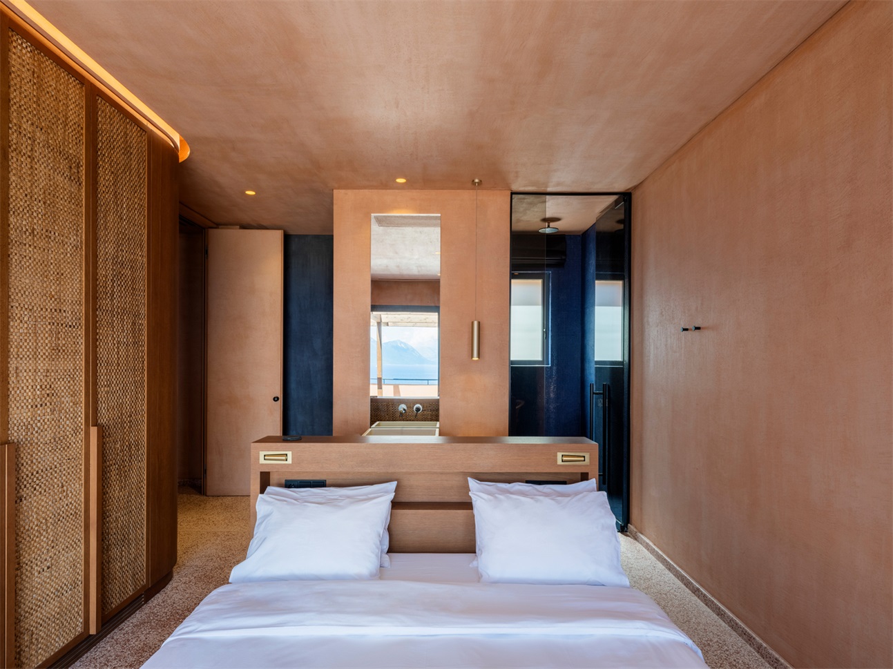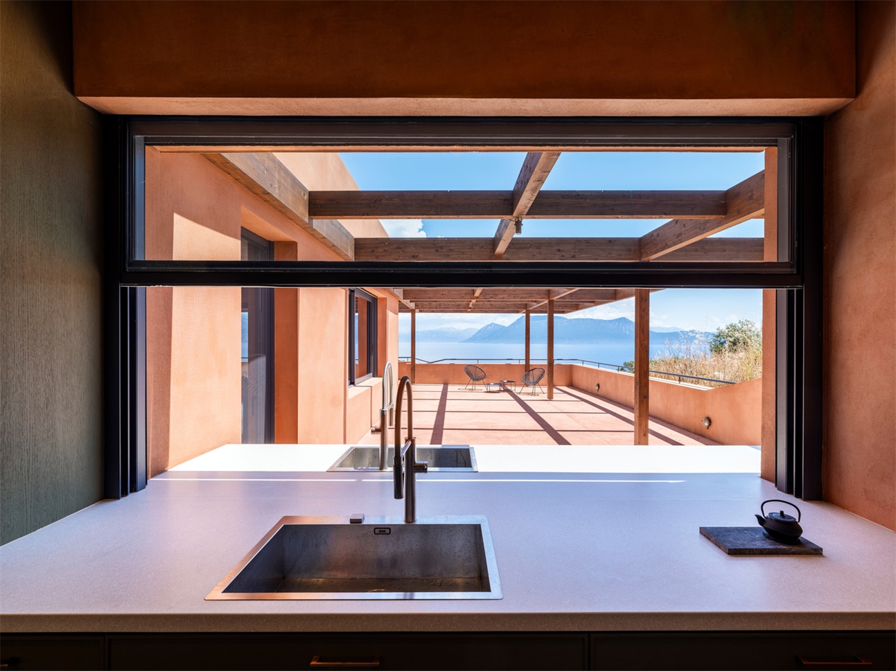 温暖的赤陶色调与自然景观相呼应,营造出一种仿佛被地球环抱的空间感,宛如从大地本身雕琢而出。质朴的纹理 —— 手工水磨石、大理石和木材 —— 统一应用于墙壁、地板和天花板,共同打造出理想的夏季住宅环境。