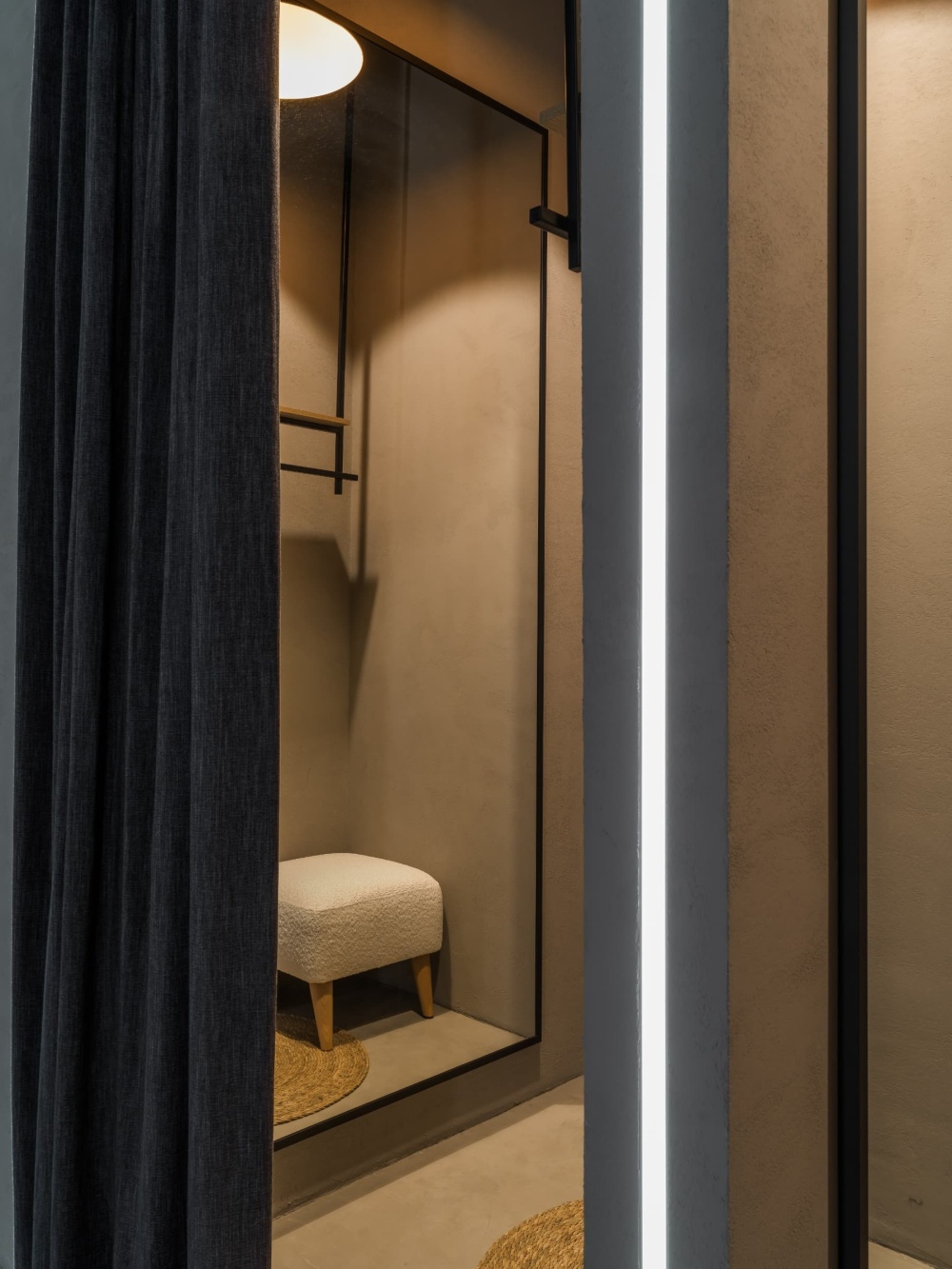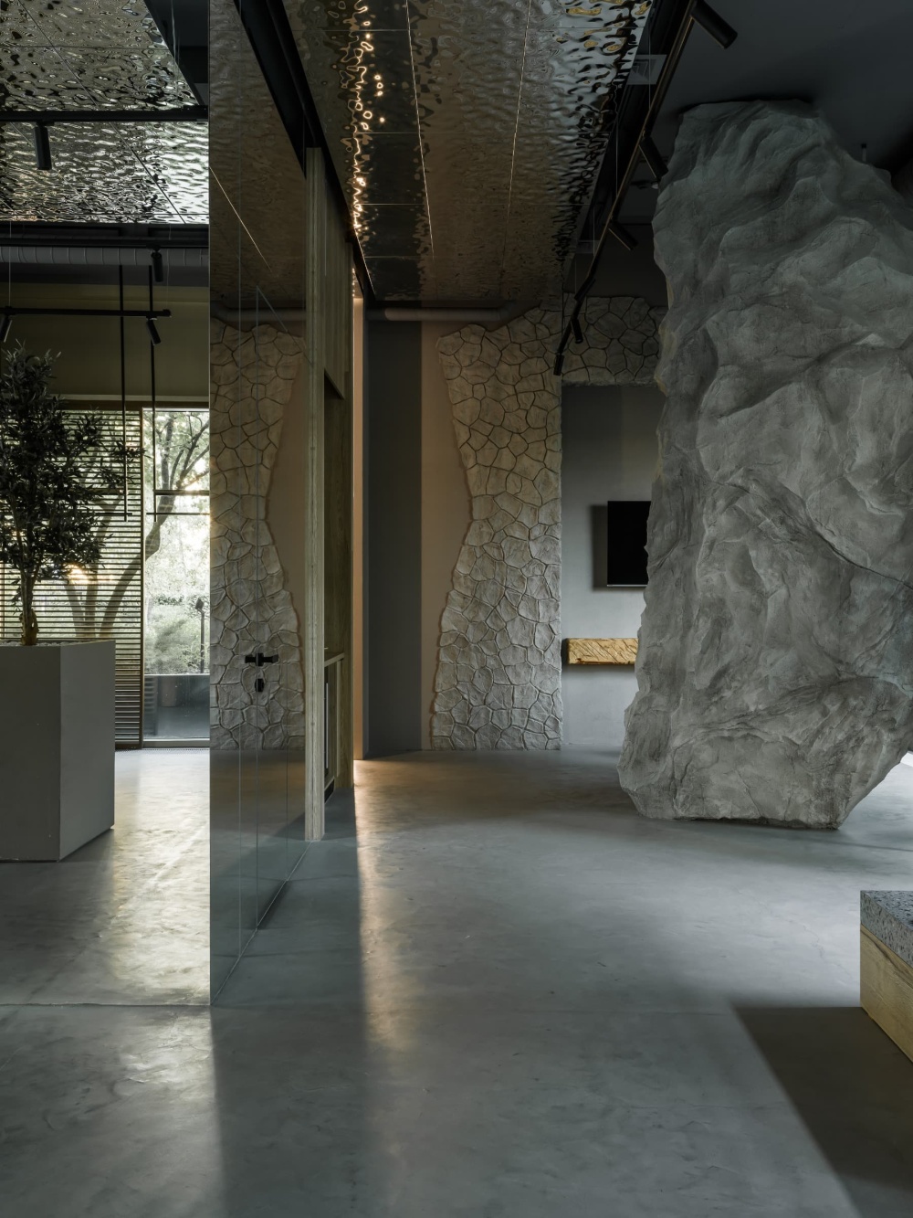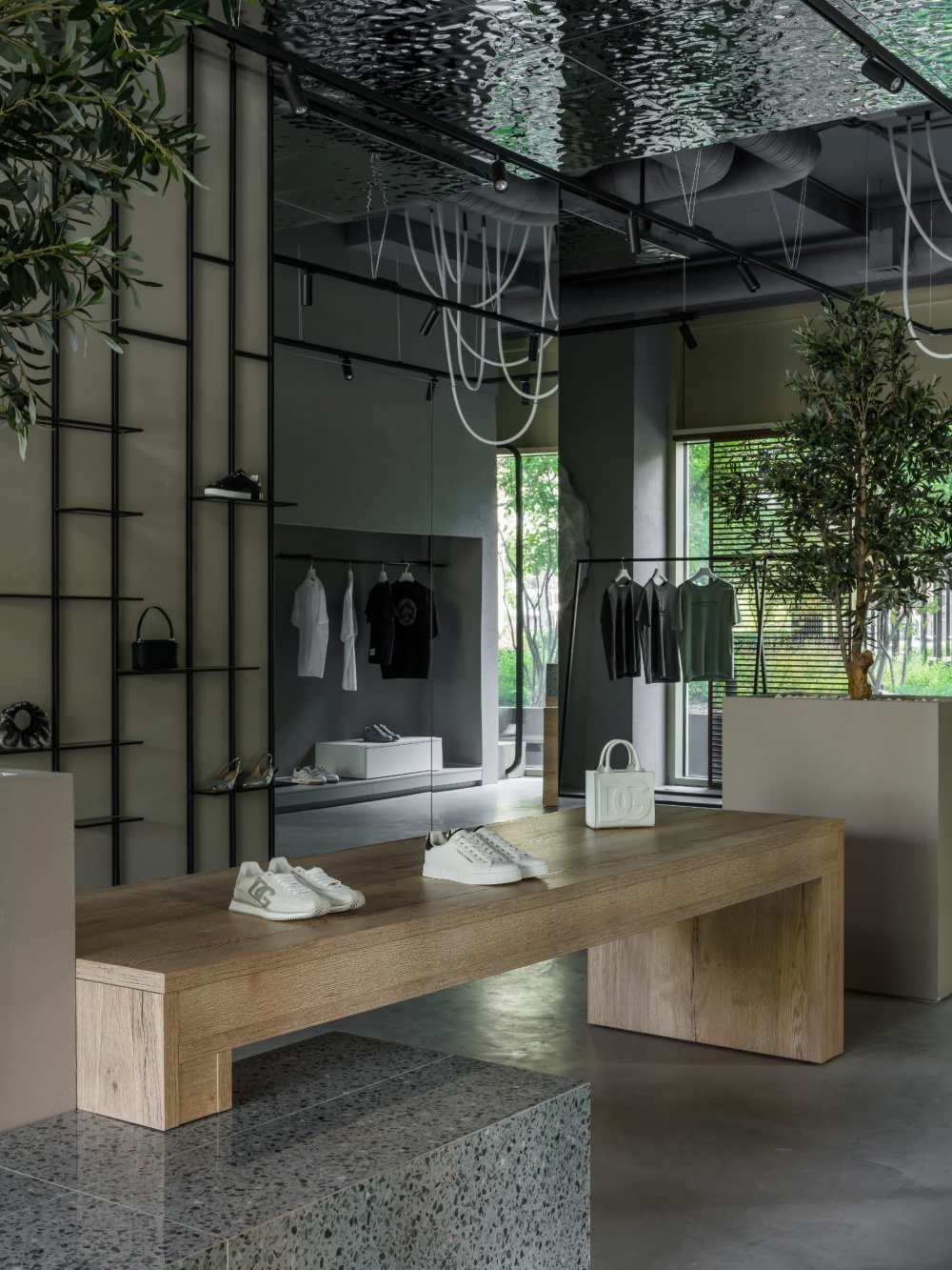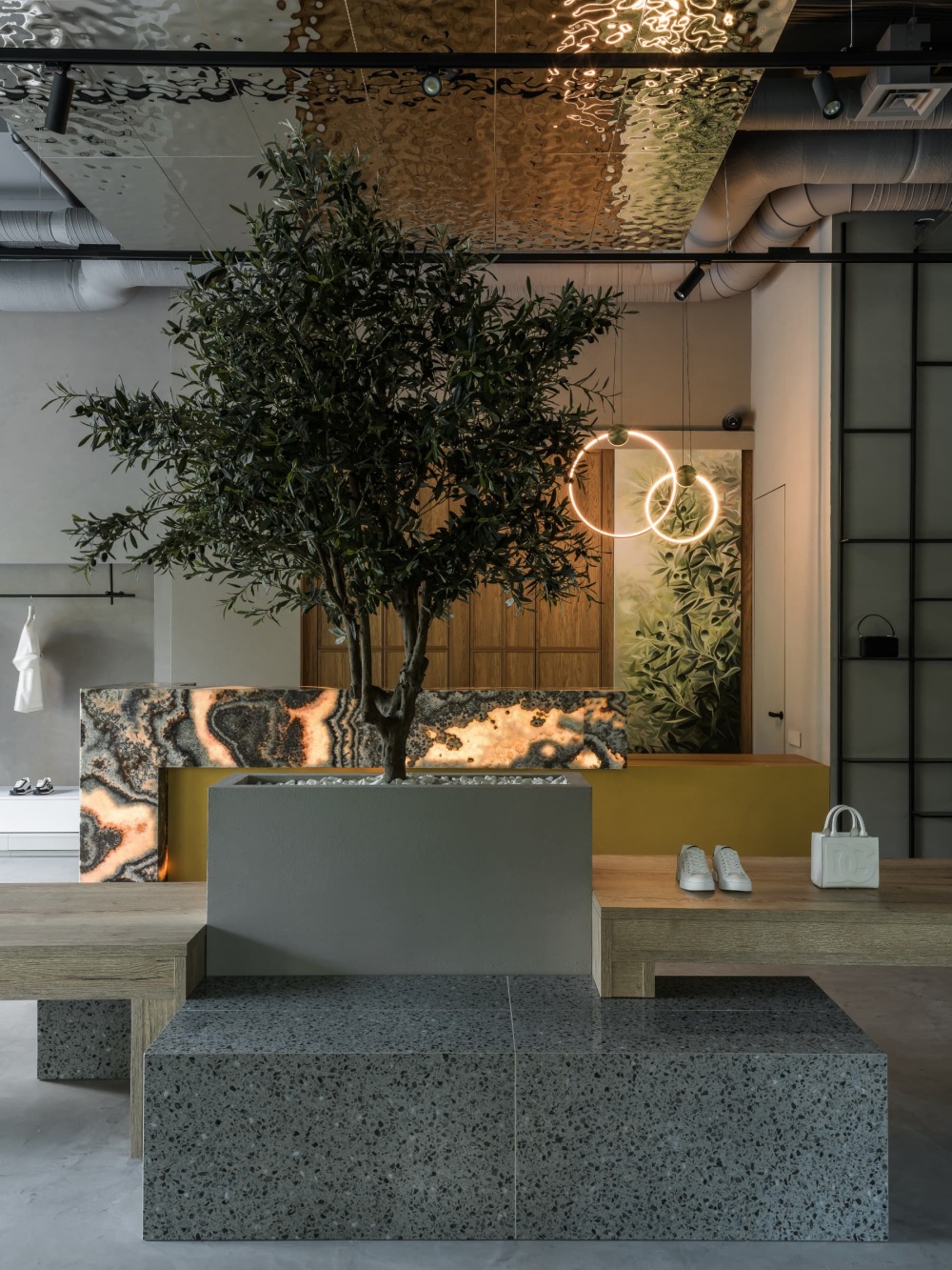 Ple Ple 的精致感藏在细节的 “手工叙事” 中。黑色金属服装架采用 “焊接 + 做旧” 的工艺,表面的氧化痕迹、接口的粗糙处理,模拟了手工铁艺的质感;收银台的玛瑙石材则以天然的纹理、绚丽的色彩,成为空间的 “视觉焦点”,其背面的线性灯光设计,让石材的每一道纹路都如珠宝般璀璨,既强化了 “手工工艺” 的价值感,又与精品店的高端定位形成呼应。试衣间区域的异形镜子更是 “手工精神” 的微观剧场 —— 不规则的轮廓、边缘的磨砂处理,都由匠人手工打磨而成,摒弃了工业化生产的标准化逻辑。镜子中倒映出的橄榄树、服装与空间,形成 “现实与镜像” 的趣味互动,让试衣体验从 “功能行为” 升华为 “空间艺术的参与式体验”。
