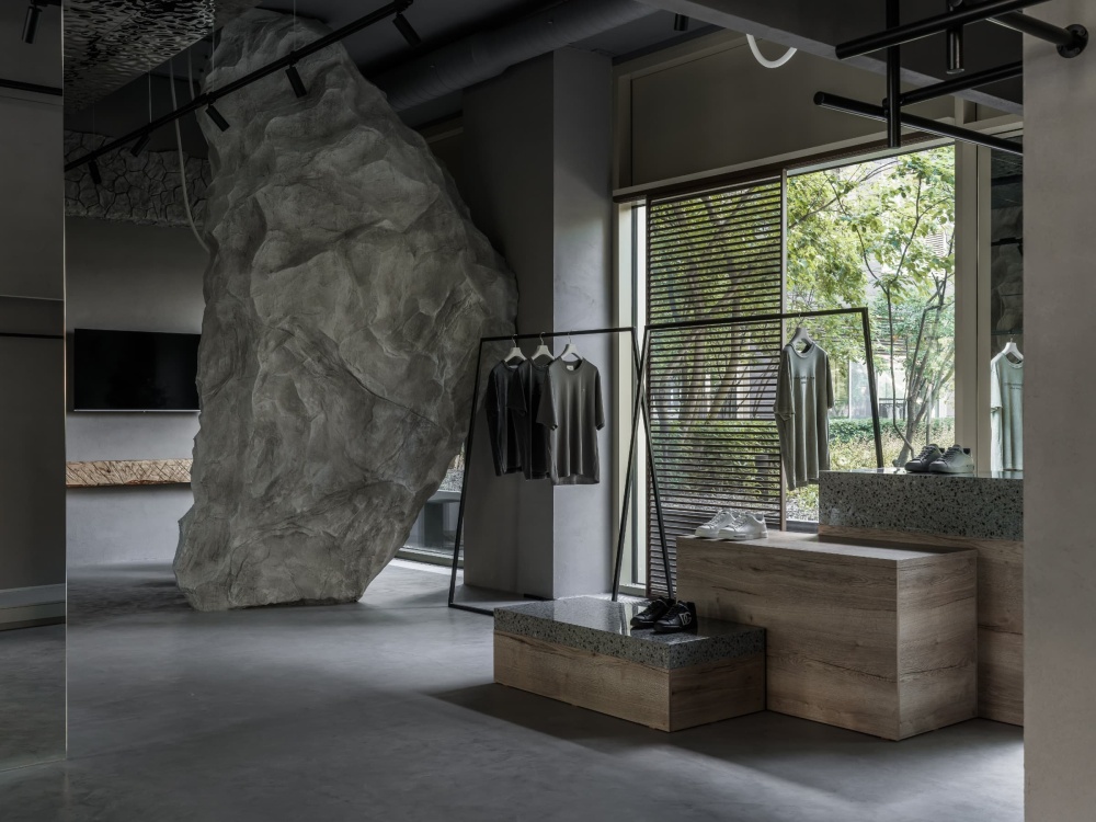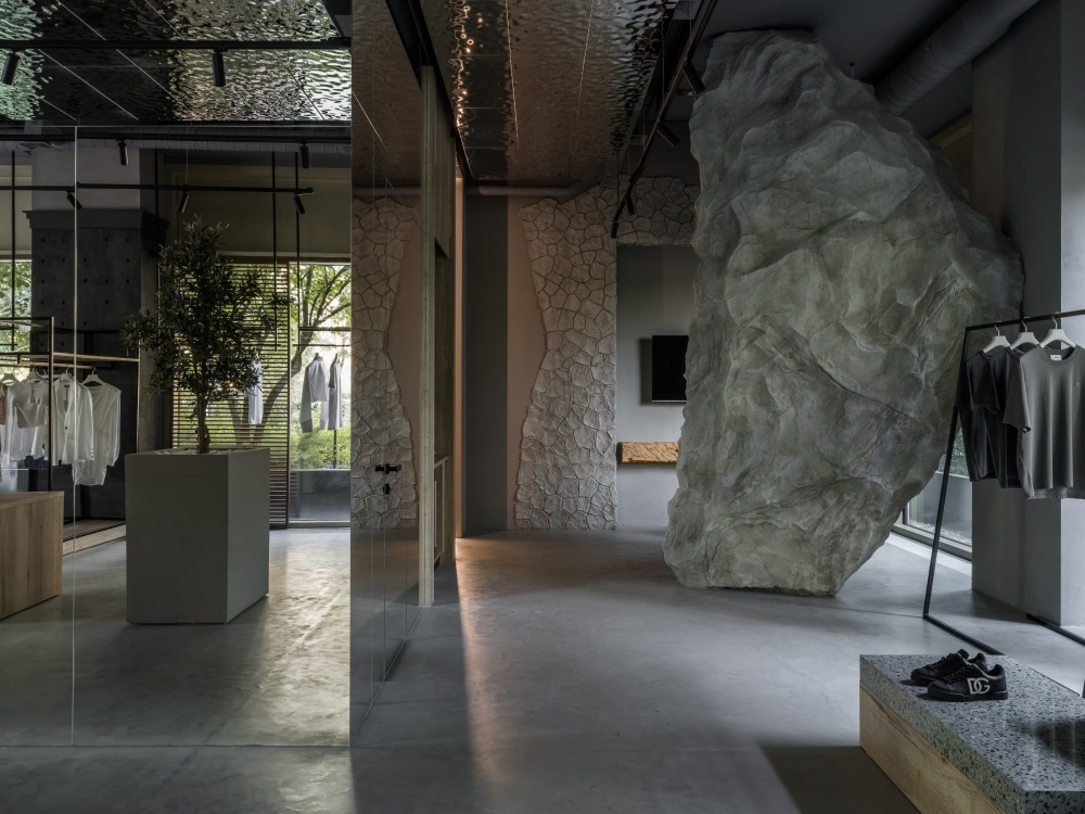 更具冲击力的是那尊巨型混凝土 “假山” 装置,它以粗犷的肌理、不规则的形态,打破了商业空间的规整感。设计师将其视为 “自然力量的隐喻”,与周边纤细的服装形成 “刚与柔” 的材质碰撞,既强化了空间的记忆点,又暗合了精品店 “多元品牌、风格共生” 的商业定位。这种对自然意象的 “夸张化处理”,让秋明的消费者在踏入空间的瞬间,便能感知到与意大利在地文化的精神联结。