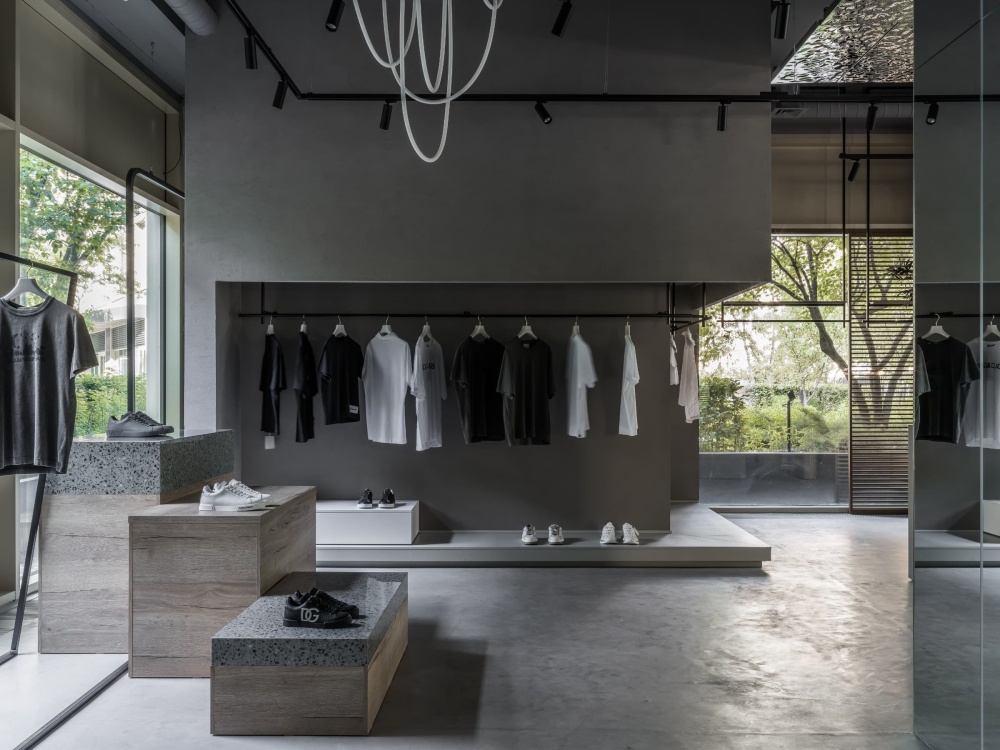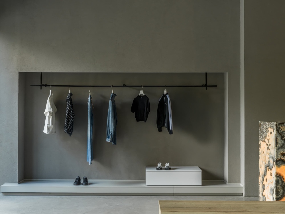 空间的材质选择以 “简约、质朴” 为核心,却在细节中暗藏手工温度。地面的清水混凝土保留了浇筑时的原始痕迹,每一道裂纹、每一处气孔都是 “手工质感” 的具象表达;墙面的灰色水泥漆则以细腻的分层工艺,营造出 “粗中有细” 的视觉层次,与意大利手工建筑中 “重视材质本真” 的理念一脉相承。木材的应用则为空间注入温暖的平衡 —— 浅橡木色的展示台、长凳采用 “原木切割” 的工艺,保留了木材的天然纹理与边缘的粗糙感,仿佛是手工匠人刚完成的作品。这种 “未完成感” 的设计,与服装的精致形成 “拙与巧” 的对比,让消费者在触摸木材的瞬间,能感受到手工精神的温度,呼应了设计师对 “意大利手工精神” 的致敬。
