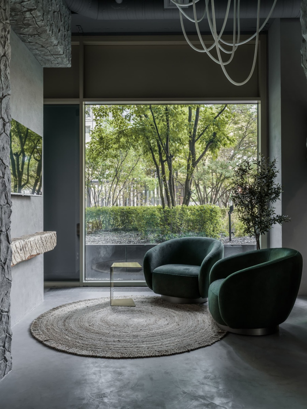 设计师以 “逛游式动线” 规划空间布局,让消费者在 “开放与私密” 的节奏变化中,获得舒适的购物体验。入口区域的开放展示区以 “橄榄树 + 中岛展台” 的组合,营造出 “集市般的热闹感”;深处的试衣间与休息区则通过半透明帘幕、石材矮墙进行软性围合,形成 “私密的休憩绿洲”。休息区的墨绿色丝绒沙发、圆形编织地毯,以 “家居化” 的陈设逻辑,打破了商业空间的疏离感,让消费者能在此停留、放松,暗合了设计师对 “舒适氛围” 的追求。这种布局既保障了品牌展示的效率,又通过空间节奏的变化,让购物体验成为一场 “探索自然、感知手工” 的沉浸式旅程。