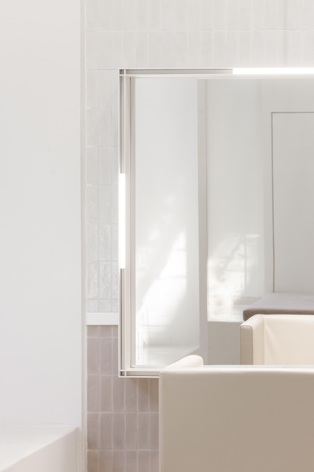 带有细腻浮雕纹理的瓷砖构成空间背景,其温润的质感与微妙的肌理变化,为触摸提供了丰富的感官体验。不同于光滑瓷砖的冰冷,浮雕纹理传递出 “手工制作的温度”,让墙面成为 “可触摸的疗愈载体”。座椅、沙发等家具选用柔软亲肤的材质,如绒布、皮革等,为访客提供 “被包裹” 的舒适感。柔软材质与硬质瓷砖形成 “刚与柔” 的对比,既保障了空间的实用性(瓷砖易清洁),又通过触感差异强化了 “放松休憩” 的氛围。连贯的白色平面贯穿整个空间,既凸显了纯粹与通透,又为光线漫射提供了绝佳载体。白色不仅放大了空间的开阔感,更传递出 “洁净、舒缓” 的心理暗示,契合美容沙龙的功能属性与疗愈理念。